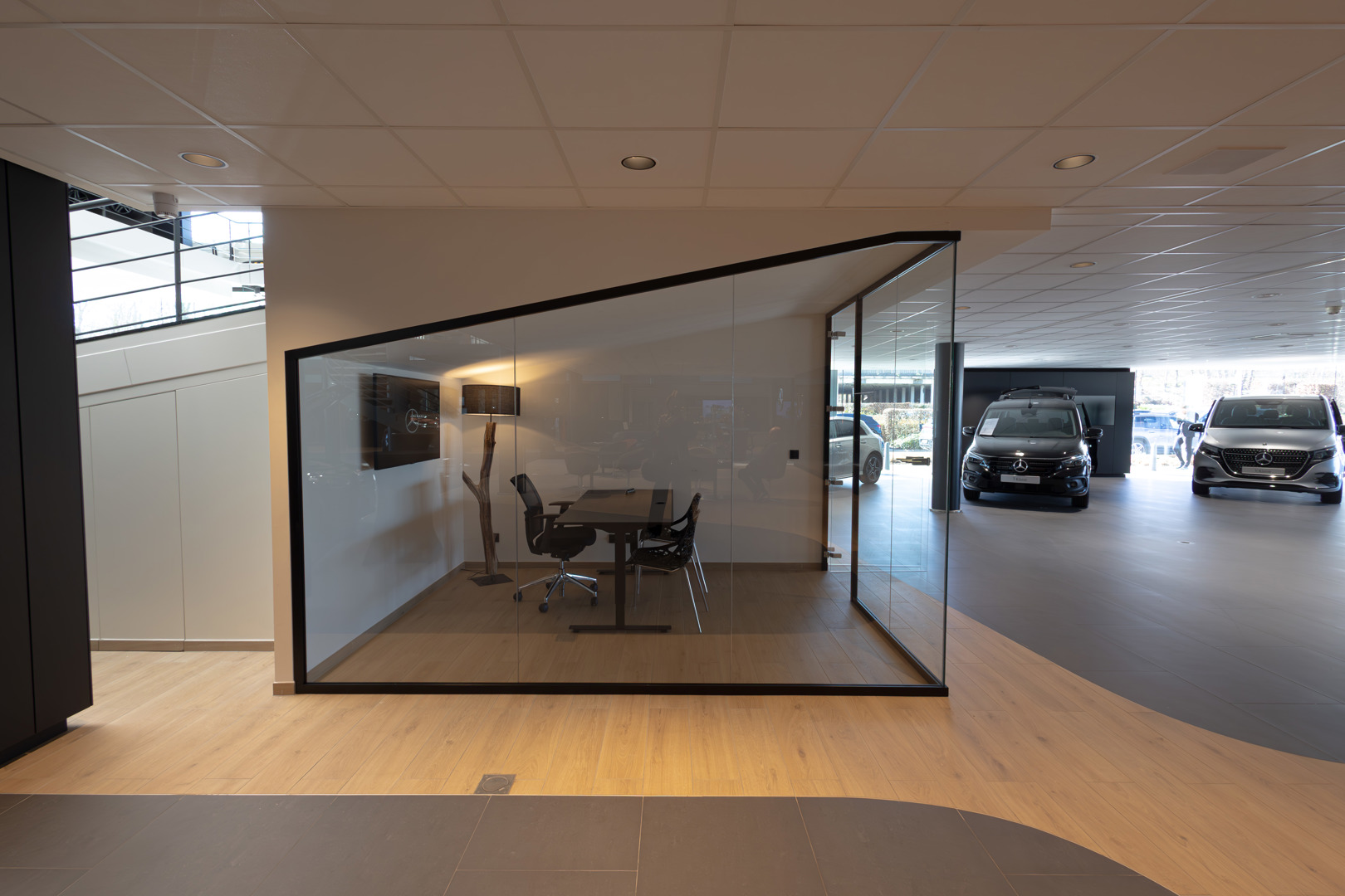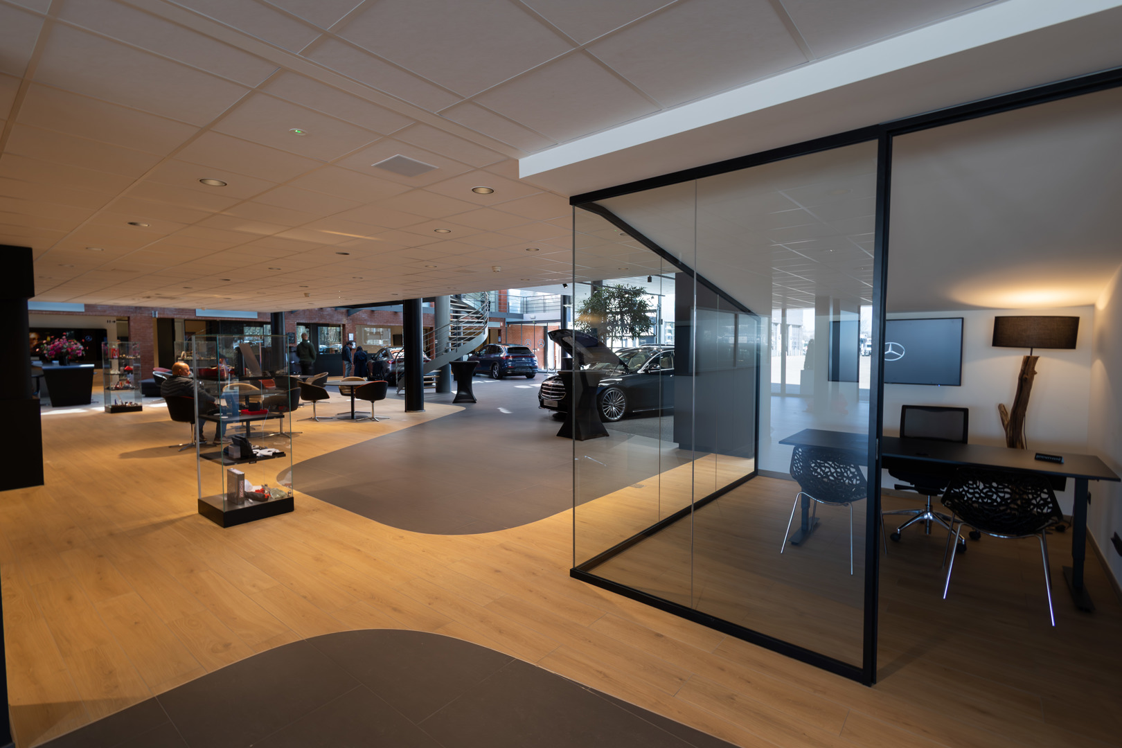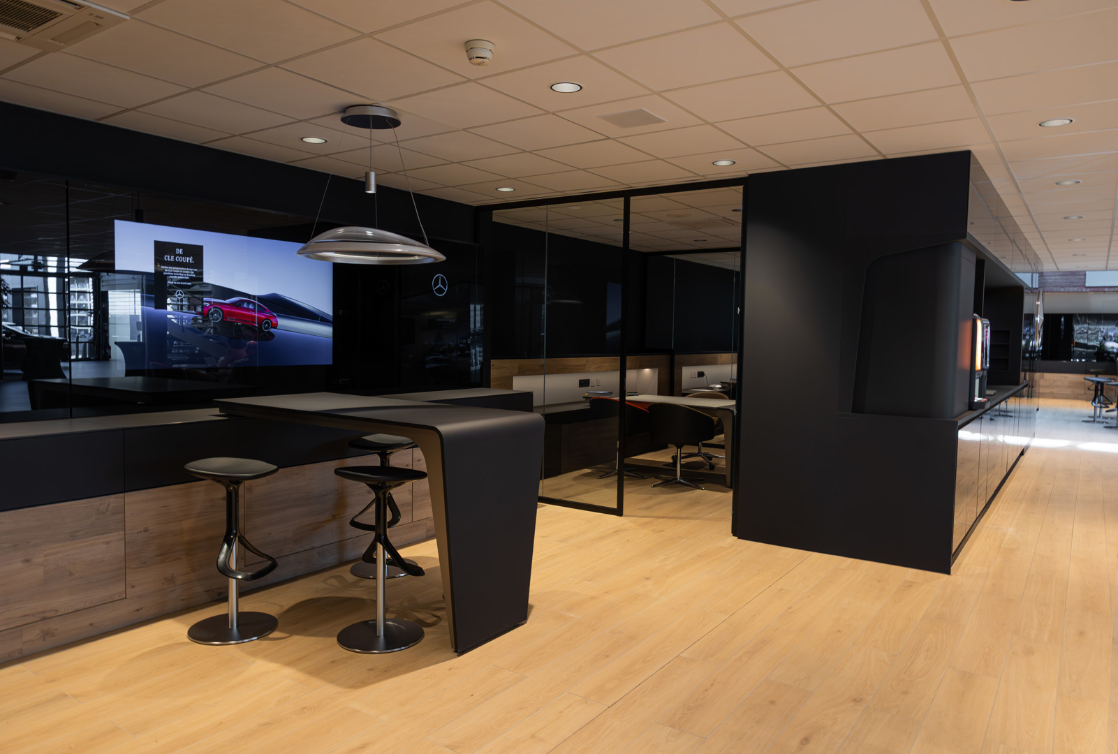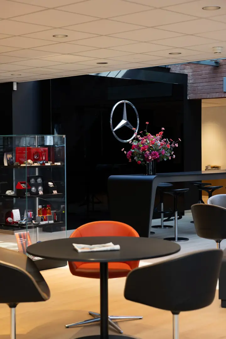 Les salles d’exposition rénovées se distinguent non seulement par leur finition, mais aussi par leur sophistication technologique. Dès l’entrée à Hasselt, par exemple, le grand mur vidéo attire immédiatement l’attention. En outre, les bureaux de vente s’adaptent au type de voiture – AMG, Mercedes-Benz, Smart ou Maybach – grâce à des ambiances lumineuses réglables qui renforcent l’identité de la marque.