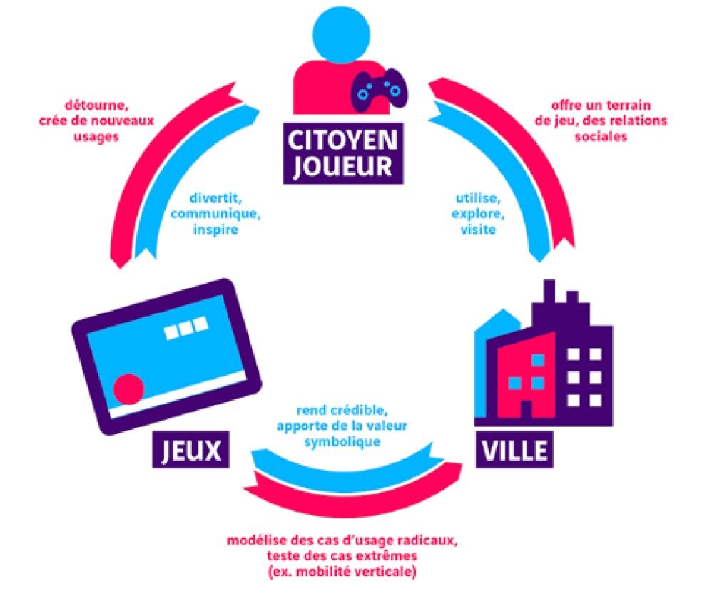 Selon Stéphane Natkin, professeur au CNAM et directeur de l’Ecole Nationale des Jeux et Médias Interactifs Numériques, l’apport principal du gameplay comme enjeu d’innovation pour la ville est le “zoom in / zoom out” qui permet de passer d’une vue à la première personne à une ‘vue hélicoptère’ de la ville. Cette capacité à passer du micro au macro en termes de vision a trouvé un certain nombre de développements dans la vie réelle, notamment Google Earth. Ceci permet d’appréhender les conséquences de certaines actions qu'on ne peut pas montrer autrement qu'en jeu. Nicolas Jaujou, anthropologue et game designer chez Ubisoft, le confirme : « Dans la vie réelle, au niveau politique par exemple, on tend à adopter une vision exclusivement macroscopique des enjeux, or l’on pourrait par exemple faire comprendre à des acteurs politiques que changer un sens interdit ou un lampadaire peut fait grogner la moitié d'un quartier d’un point de vue micro ».