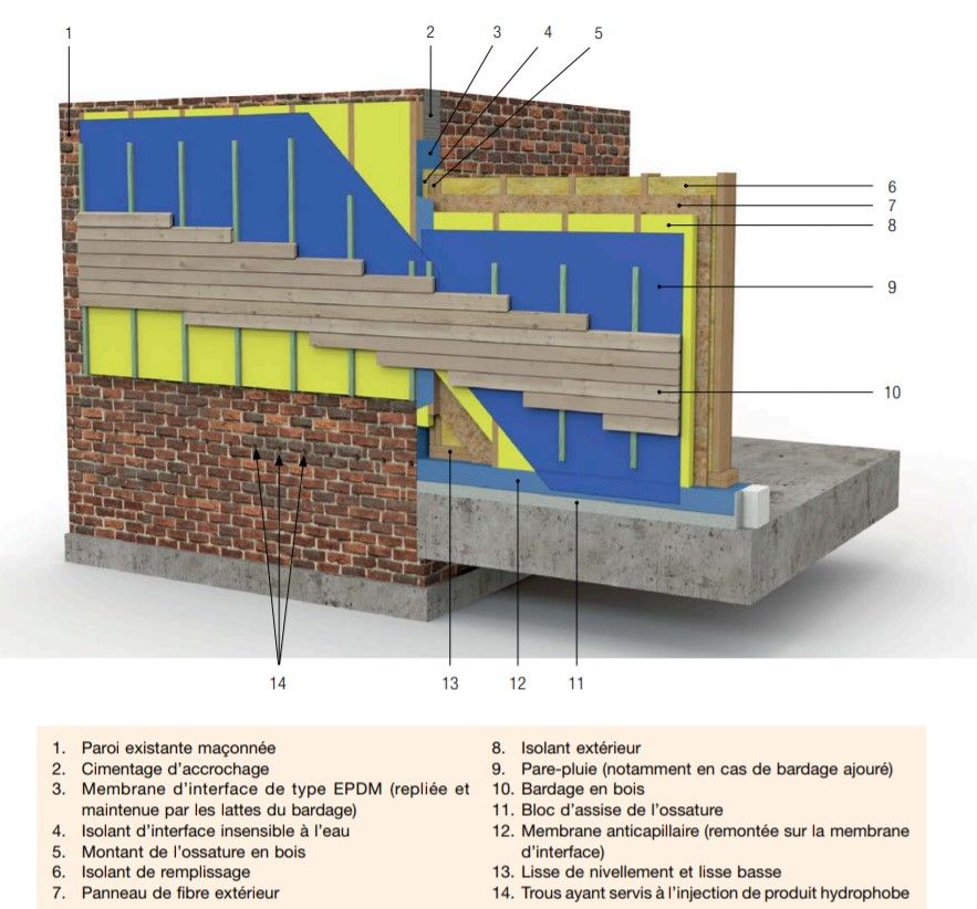 Un traitement initial, tel qu’un cimentage de la paroi existante, peut toutefois s’avérer nécessaire pour garantir une meilleure adhérence de la membrane d’interface sur cette paroi. Cette membrane est collée ou fixée mécaniquement à l’aide des lattes du bardage en bois de l’extension. Même si la construction existante dispose d’une membrane anticapillaire, il est indispensable de relever verticalement celle de la nouvelle construction sur la membrane d’interface. En effet, un chevauchement horizontal entre les deux membranes anticapillaires ne peut pas être réalisé. Il convient de garantir la continuité entre la membrane anticapillaire et la membrane d’interface par un chevauchement de plus de 10 cm.