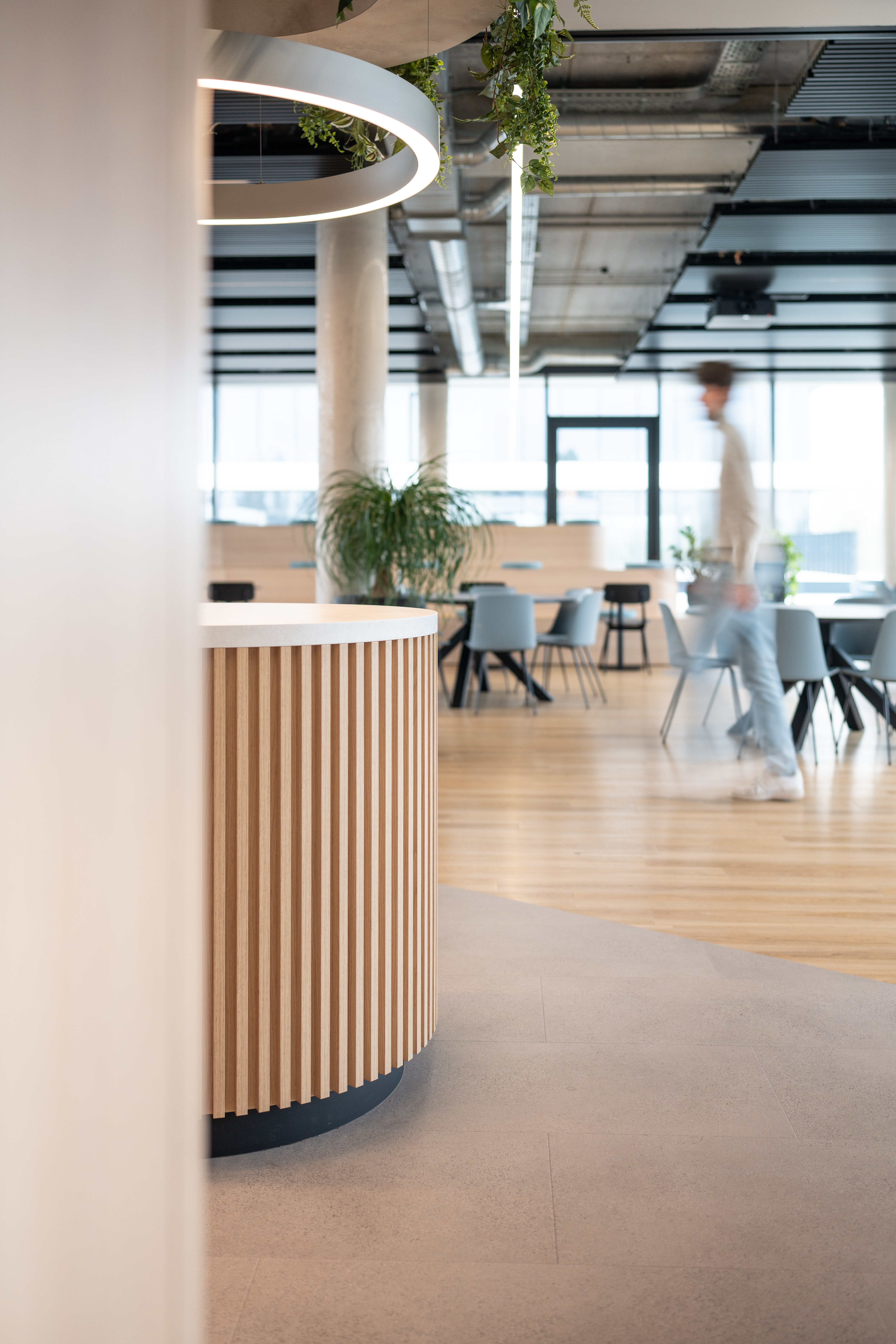 Le design — signé par le bureau CAPTIF — se distingue par l’omniprésence de formes courbes : dans les cloisons, le mobilier et les revêtements de sol. « Pour que tout s’emboîte parfaitement, une coordination technique rigoureuse était nécessaire », précise Frederick. « Le rayon des cloisons, installées en premier, devait être parfaitement aligné avec celui du mobilier et du sol, à la fois en production et lors du montage. »