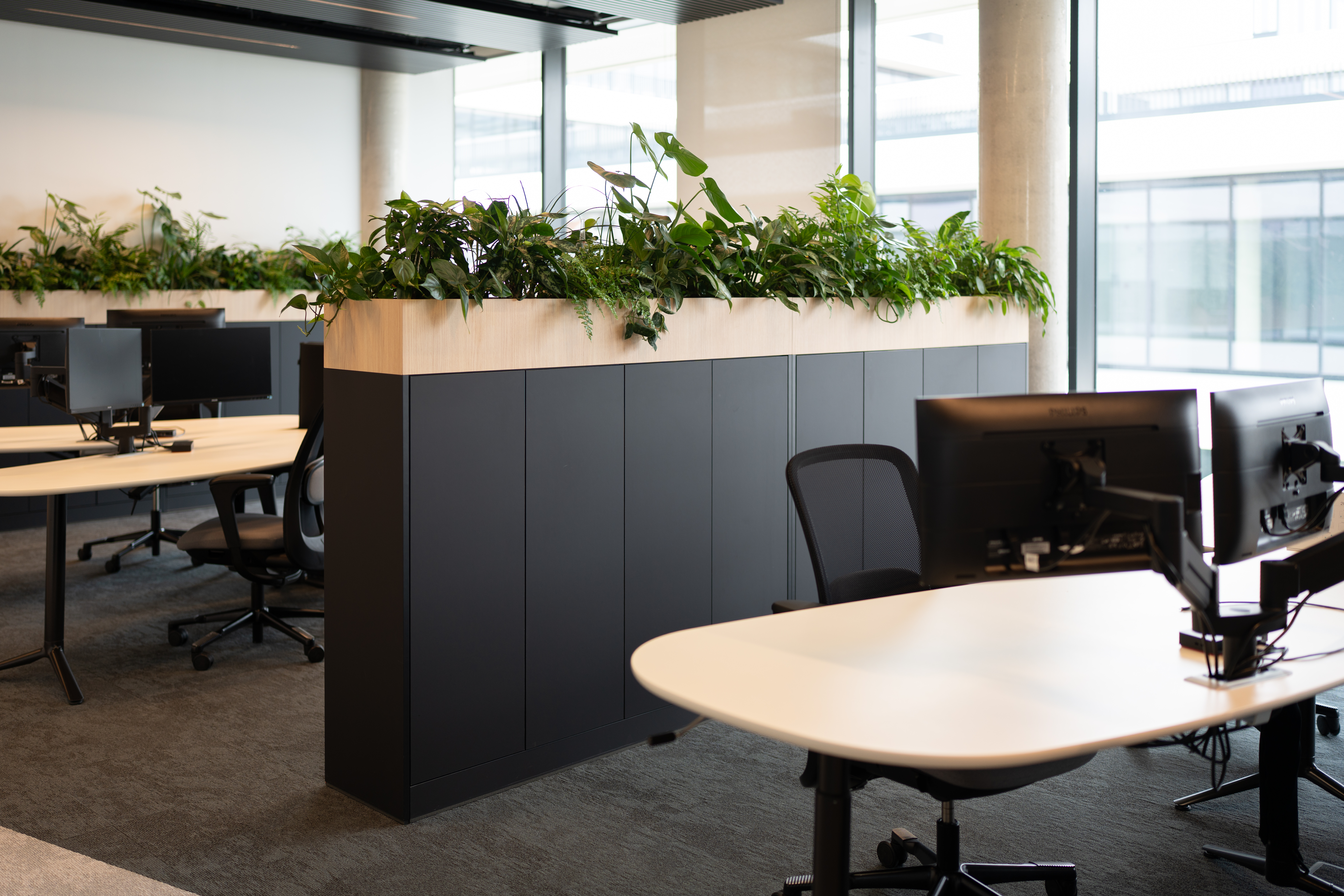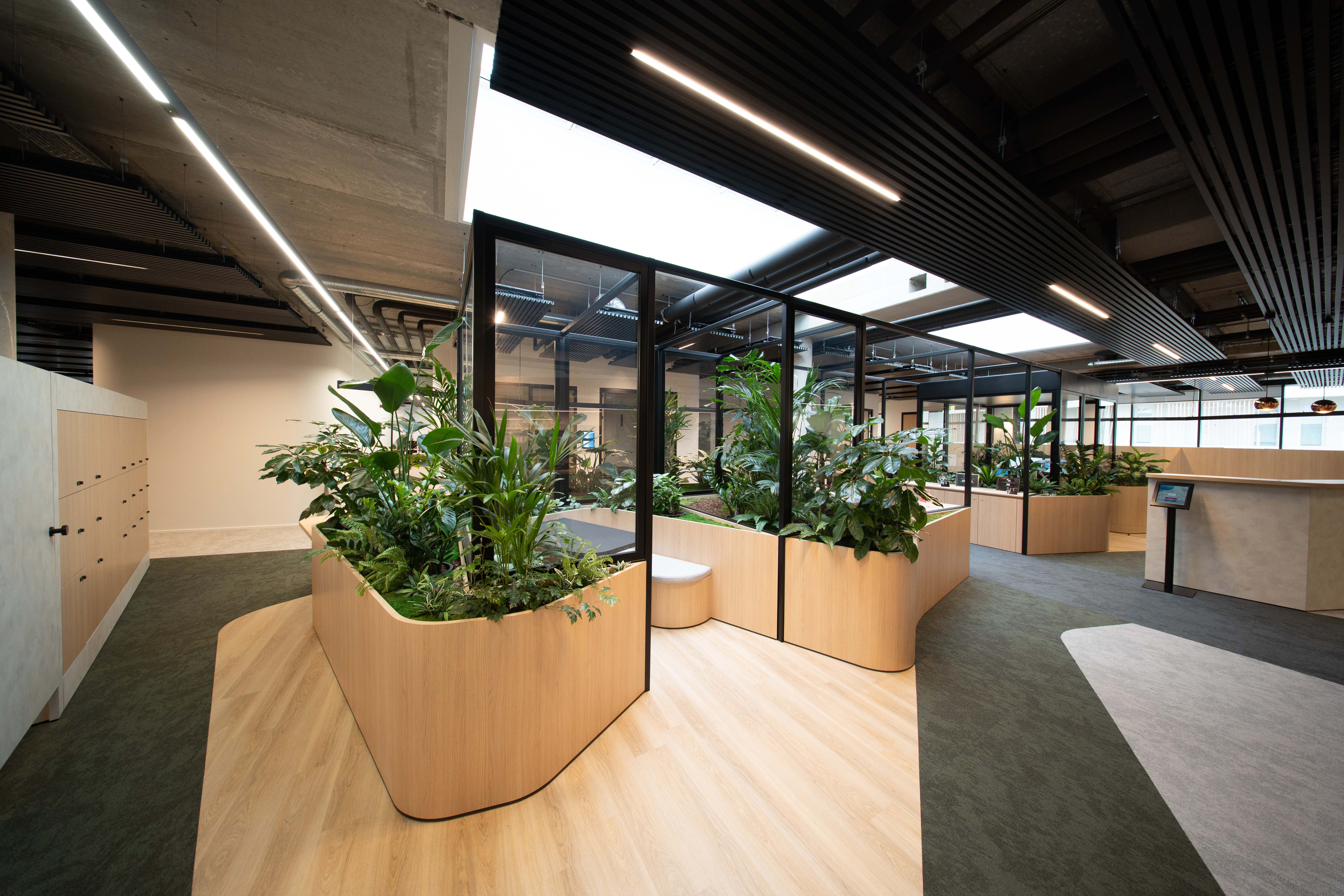 Dès l’entrée dans les nouveaux bureaux d’EG, on est frappé par l’ambiance naturelle et accueillante. L’élément phare : l’espace d’accueil et d’attente, conçu comme une véritable accroche visuelle. Dans une structure en acier sur mesure sont intégrés des cloisons vitrées, des jardinières et des éléments de menuiserie pour créer une zone assise confortable et protégée.