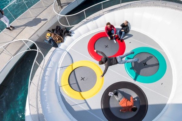 Lily est une installation sensorielle adaptée à tous les âges proposant diverses aventures tandis que le pont constitue une charmante promenade qui invite à la contemplation. Les bouées géantes qui abritent les trampolines peuvent constituer des lieux de repos, pour s'allonger au soleil.