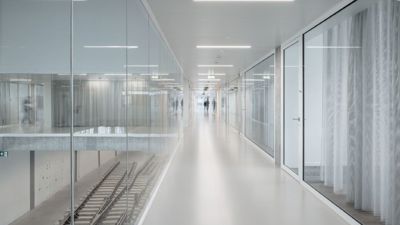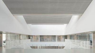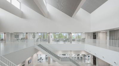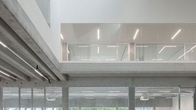 Les formations dispensées dans la nouvelle Infrabel Academy sont divisées en une partie théorique et une partie pratique. Bien que ces deux fonctions soient dotées d’entrées séparées, il était souhaitable de créer une identité commune forte à l’ensemble. « C’est pour cette raison que nous avons basé la conception sur le passage dans le bâtiment qui relie le côté rue Dubois Thorn au quai », précise-ton chez Kempe Thill. « Là se situent deux entrées, l’une d’elle amène à la section théorique, l’autre à son opposé donne accès à la section de formation pratique. La zone d’enseignement pratique se situe au rez-de-chaussée et est directement reliée aux installations extérieures. La section théorique commence de l'autre côté du rez-de-chaussée et occupe également tout l'étage supérieur. Trois atriums structurent le bâtiment, qui malgré sa longueur et grâce à ces espaces collectifs, se voit ainsi doté d’une identité et une variété spatiale. Un atrium marque l'entrée de la section théorique, un second celle de la zone pratique. Un troisième atrium crée un lien visuel entre les ateliers de formation pratique et les salles d’enseignement théorique. Les trois atriums reçoivent la lumière naturelle grâce à de généreuses toitures en shed. En raison de la répartition des locaux techniques, des ascenseurs ainsi que des gaines, on peut voir à travers le passage dans le sens longitudinal du bâtiment les deux zones jusqu'aux confins du bâtiment. Dans le sens transversal également, les grandes surfaces vitrées permettent de voir à travers tout le bâtiment. À l’intérieur les couleurs et les matériaux caractérisent une atmosphère légère et conviviale. Le béton apparent est combiné avec des murs en blocs de béton blanchis à la chaux, à des plafonds suspendus blancs et à de nombreuses grandes surfaces vitrées. Des rideaux acoustiques permettent de créer une certaine intimité dans les salles de cours. »