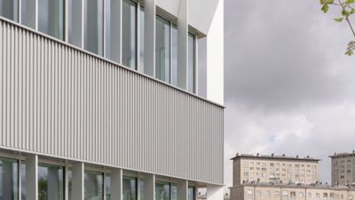 Lors de la conception de la façade, les architectes ont dû prendre en compte les exigences de normes environnementales de la maison passive qui s'appliquent à tous les nouveaux bâtiments ainsi que les dimensions relativement étroites de la trame de la façade (1,5 m). Pour protéger l’intérieur du soleil, ils ont saisi cette occasion pour travailler avec des lamelles verticales fixes en aluminium, combinées à des écrans textiles. Cela permet une tension entre l’extérieur et l’intérieur car, vues d’une certaine distance, les lamelles semblent fermées et transforment la façade en une surface argentée, alors que de l’intérieur le bâtiment donne une impression de transparence et d’ouverture. L'aluminium gris-argent, anodisé naturellement, fait référence au caractère industriel de la zone. La façade permet de grandes variations grâce aux reflets et aux ombres des lamelles selon l'endroit d’où l’on regarde. Cela crée une perception dynamique, en accord avec le passage des trains. L'homogénéité de la façade à lamelles n'est interrompue que par le passage intérieur, renforcée de part et d’autre par une sorte de vitrine fixe qui marque clairement l'accès principal. Les parties aveugles de la façade sont recouvertes de tôle ondulée. La tôle est finement nervurée et s’accorde ainsi aux lamelles pare soleil. Les grilles de ventilation s’intégrent subtilement à la tôle ondulée grâce à des perforations locales. Le lettrage du bâtiment 'Infrabel Academy' est réalisé de manière similaire et combiné à un éclairage par l'arrière, le faisant ressortir fortement dans l'obscurité. « Le toit, facilement visible des bâtiments alentours en surplomb, est conçu comme une cinquième façade. C'est pourquoi les espaces techniques nécessaires sont conçus en même temps que les toits en sheds des atriums. Un grand étage sous le toit est ainsi créé, varié et rythmé dans son volume. Les sheds créent une lumière uniforme, presque semblable à celle d'un atelier et sont une référence au caractère industriel du quartier et du site. La partie plate du toit est végétalisée et confère au bâtiment un aspect doux et naturel. »