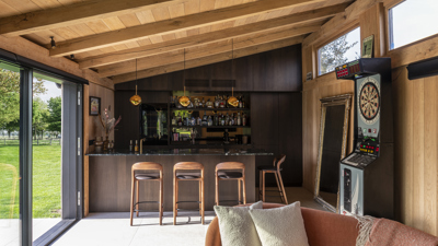 L’espace de vie supplémentaire a été aménagé avec un bar élégant et un salon contemporain, idéal pour recevoir des invités ou se détendre en toute tranquillité. À l’extérieur, la terrasse avec espace lounge invite elle aussi à la détente, dans un écrin de verdure. Ce studio de jardin en bois au look rustique est bien plus qu’un simple ajout esthétique à la maison : il s’agit d’un espace confortable et multifonctionnel, où il fait bon vivre toute l'année.