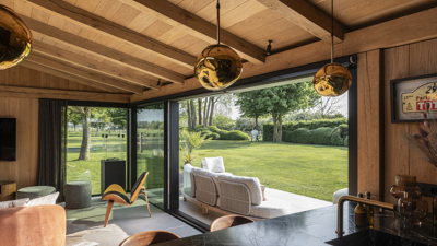 À l’intérieur, ce studio de jardin moderne respire l’élégance. L’aménagement associe charme intemporel et confort contemporain, avec un plafond composé de voliges en chêne massif apparentes et de poutres élégantes, en parfaite harmonie avec les murs entièrement habillés de chêne massif. Ces matériaux naturels apportent à l’espace une atmosphère chaleureuse et contribuent à une ambiance luxueuse. De larges baies vitrées en aluminium noir laissent entrer une lumière abondante et offrent une vue panoramique sur le jardin et les prairies environnantes, renforçant la sensation d’espace et de connexion avec la nature.