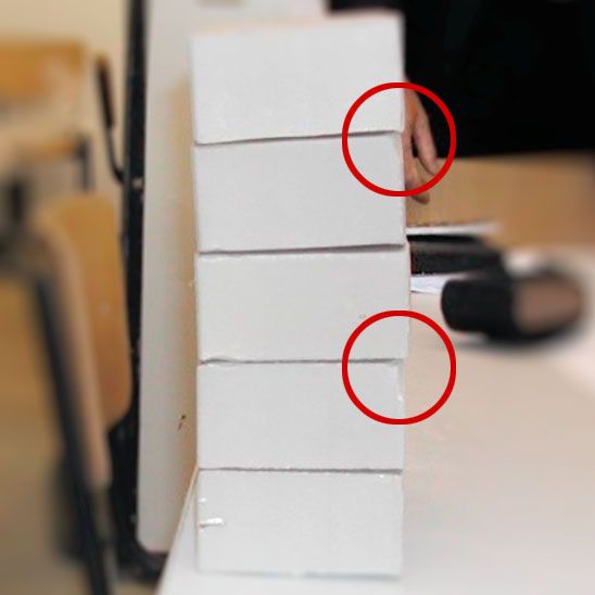 Il est important par ailleurs d’adapter l’épaisseur des joints, de manière à pouvoir reprendre les différents écarts dimensionnels des briques. Ainsi, on constate parfois que l’on a maintenu l’épaisseur des joints verticaux en y insérant des plaquettes en plastique. Toutefois, en procédant de la sorte, l’écart sur la longueur des briques aura des conséquences inévitables sur l’alignement des joints verticaux. En pratique, dans le cas d’une maçonnerie de parement à joints minces, on optera de préférence pour un appareillage sauvage (joints verticaux non alignés), en particulier lorsque les briques présentent des écarts dimensionnels importants sur leur longueur.