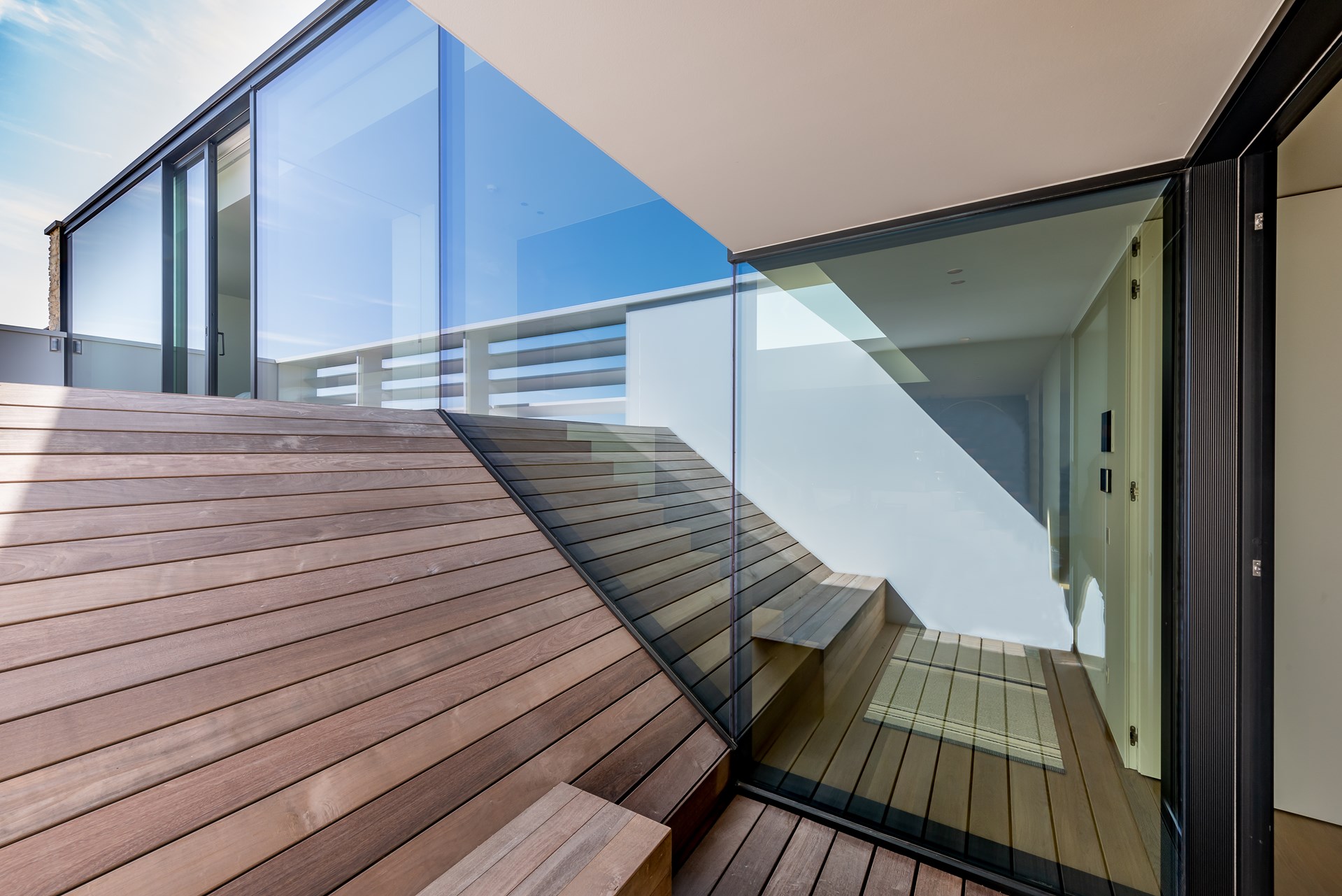 Autour de l'escalier, qui fait la transition entre l'intérieur et l'extérieur, la forme trapézoïdale est mise en valeur par des détails raffinés. Les lignes inclinées de l'escalier ont été entièrement vitrées. « Il aurait été plus facile de les séparer par un mur fermé. Mais nous les avons transformées en une histoire unique avec Corswarem et Schüco », souligne Gregory Nijs.