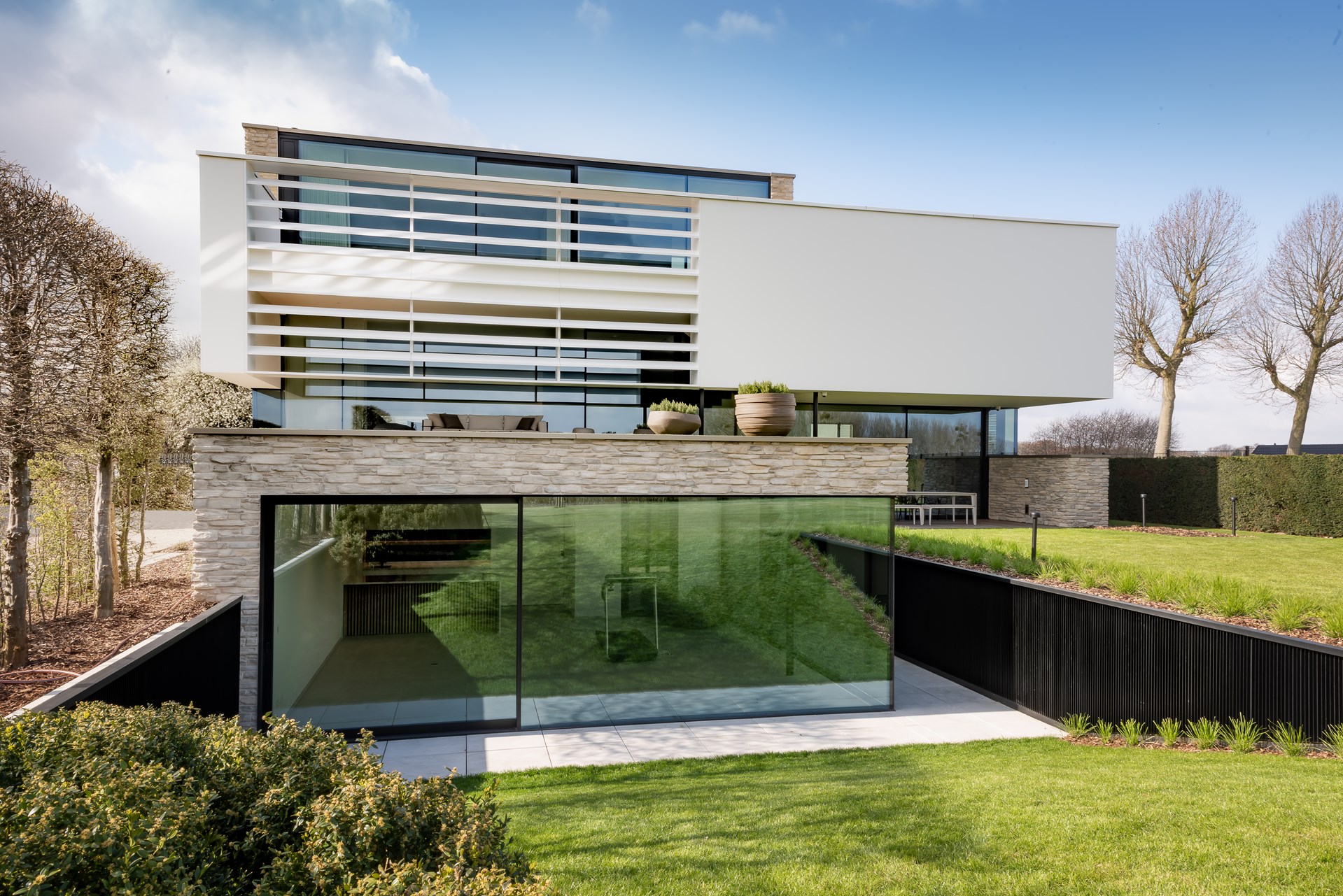 Klaarchitectuur a conçu une résidence privée particulière à Tongres : moderne, minimaliste et dotée d'innovations techniques surprenantes, avec une contribution importante de Ramenconstructie Corswarem. Le design inhabituel est ce qui attire le plus l'attention : un volume « flottant » ou une boîte blanche sur un rez-de-chaussée partiellement encastré et entièrement vitré. Schüco a participé à ce début et l'a réalisé d'une main de maître.
