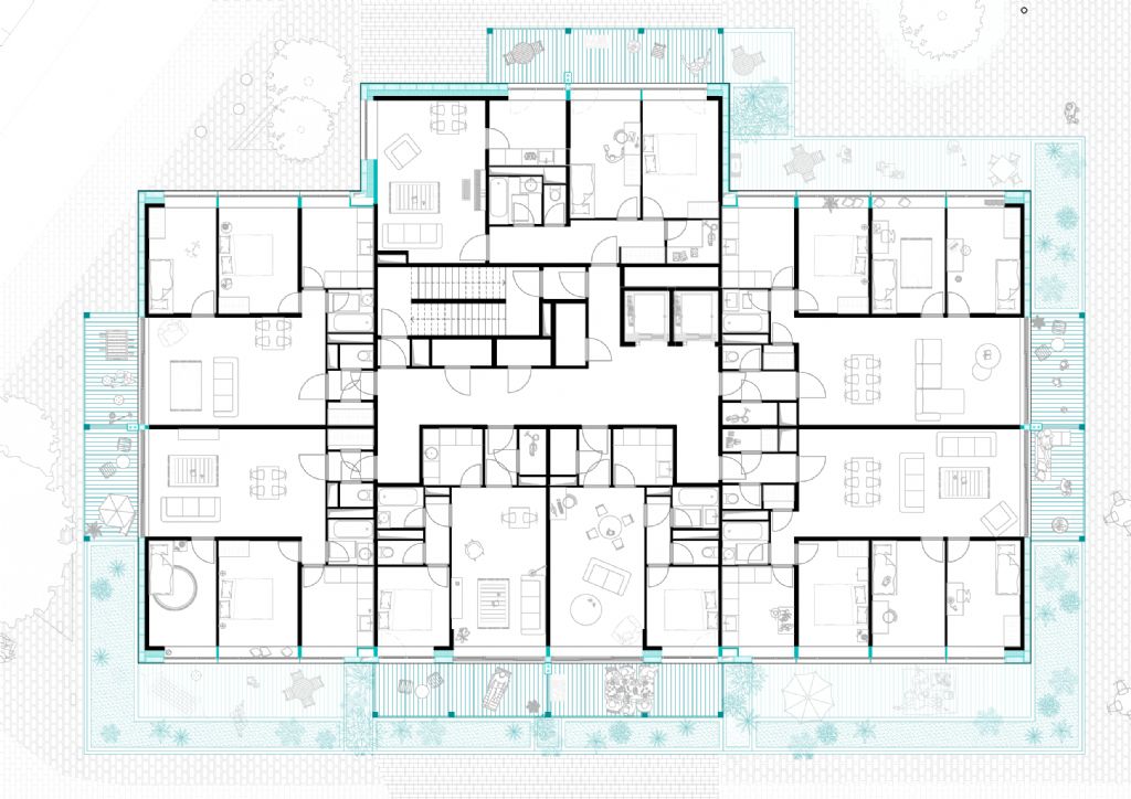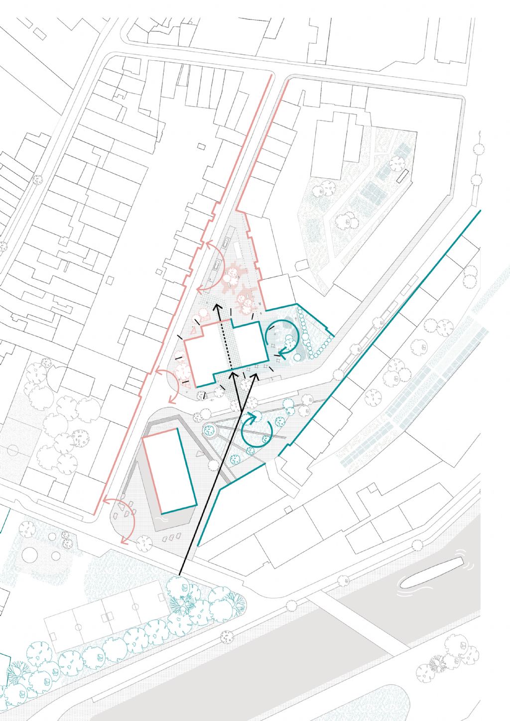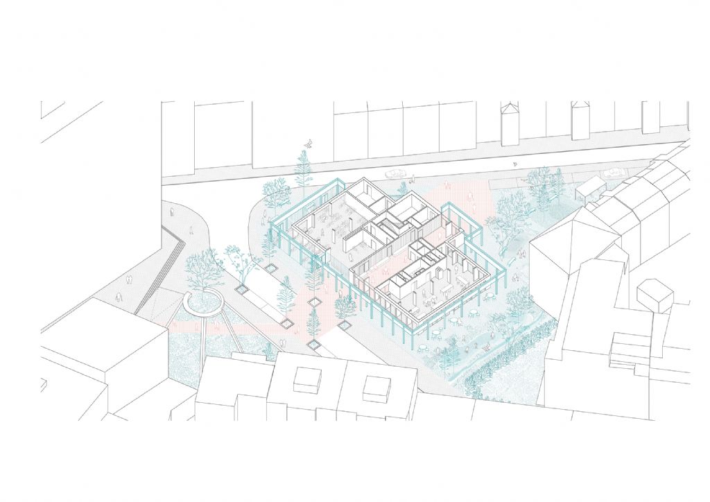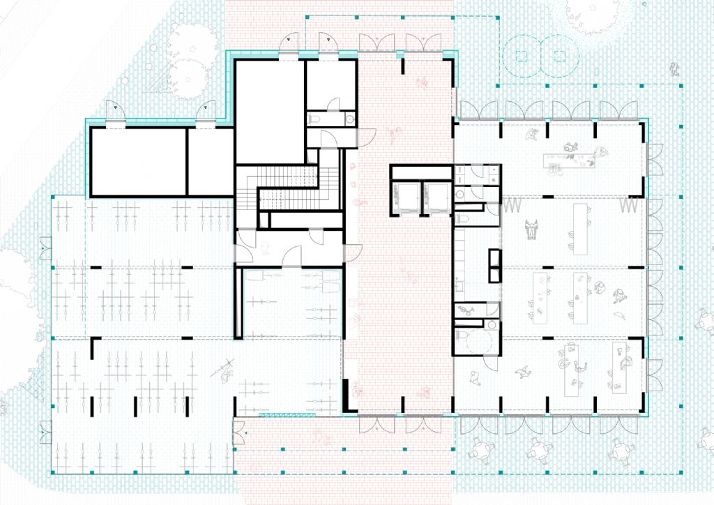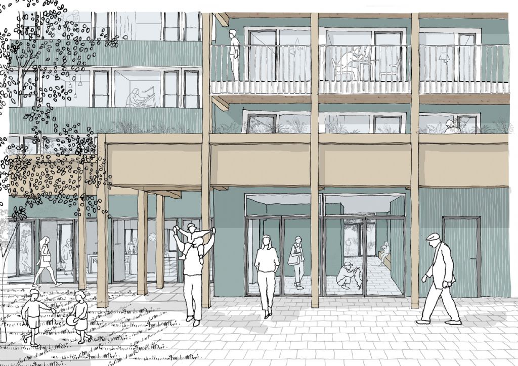 Le rez-de-chaussée sera complètement ouvert pour activer le bâtiment de tous les côtés. Il y aura également un nouvel abri à vélos et une salle polyvalente qui pourra être utilisée par diverses associations de quartier, comme la banque alimentaire existante.