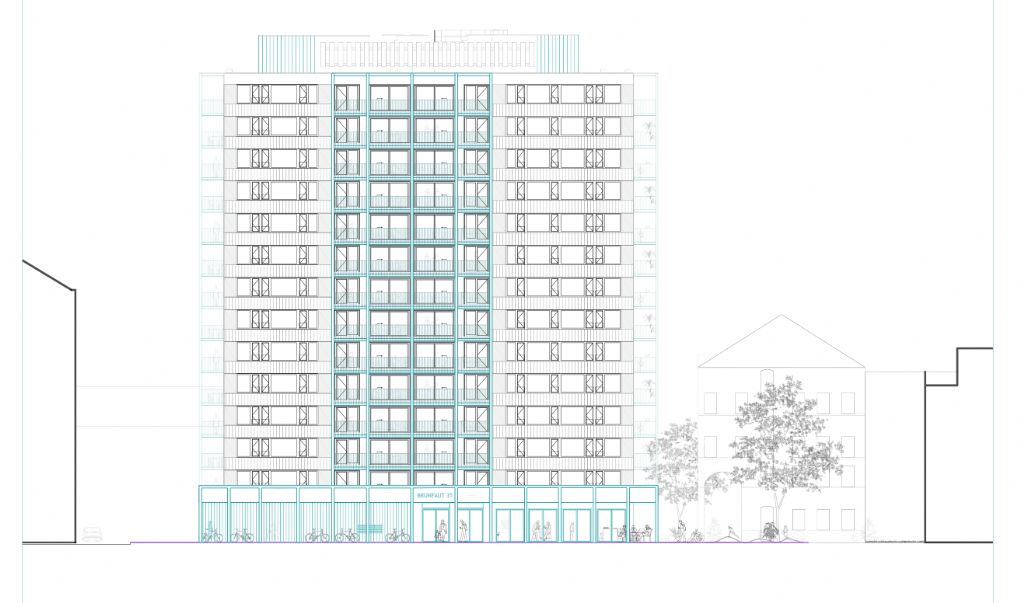 La tour résidentielle Brunfaut 35, à Molenbeek-Saint-Jean, compte à ce jour 93 logements sociaux. La façade existante, avec ses nombreux angles et arêtes, sera redressée afin de simplifier au maximum l'isolation thermique de l'enveloppe extérieure et une structure en bois sera placée devant la nouvelle façade pour offrir à chaque logement un espace extérieur de qualité. Au rez-de-chaussée, cette structure constituera également l'extension pour le parking à vélos et offrira de grandes terrasses supplémentaires au premier étage.
