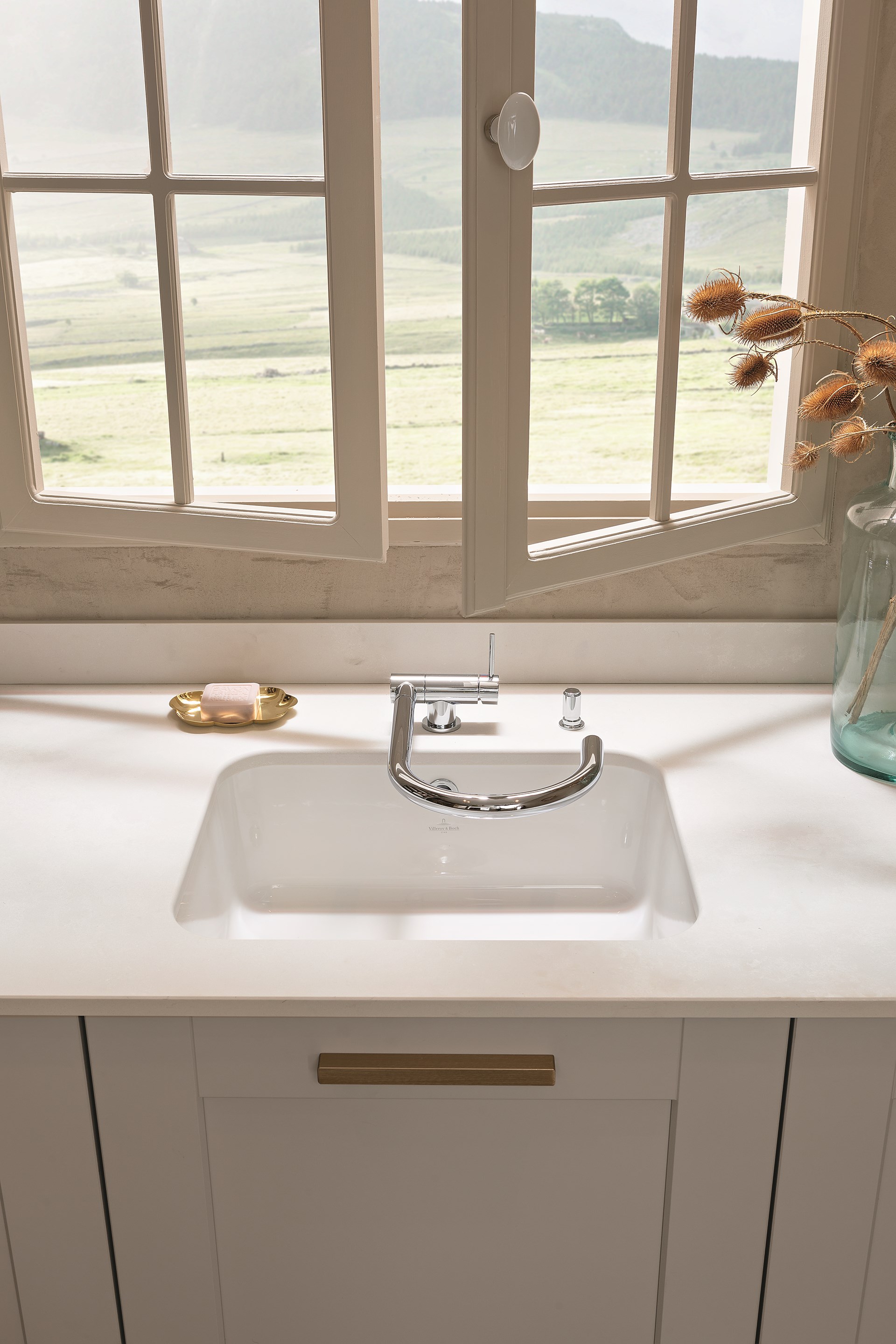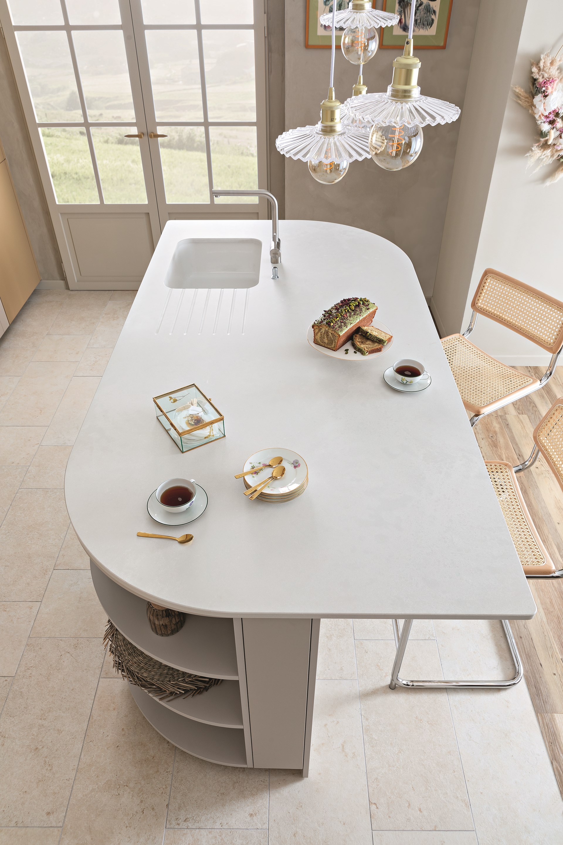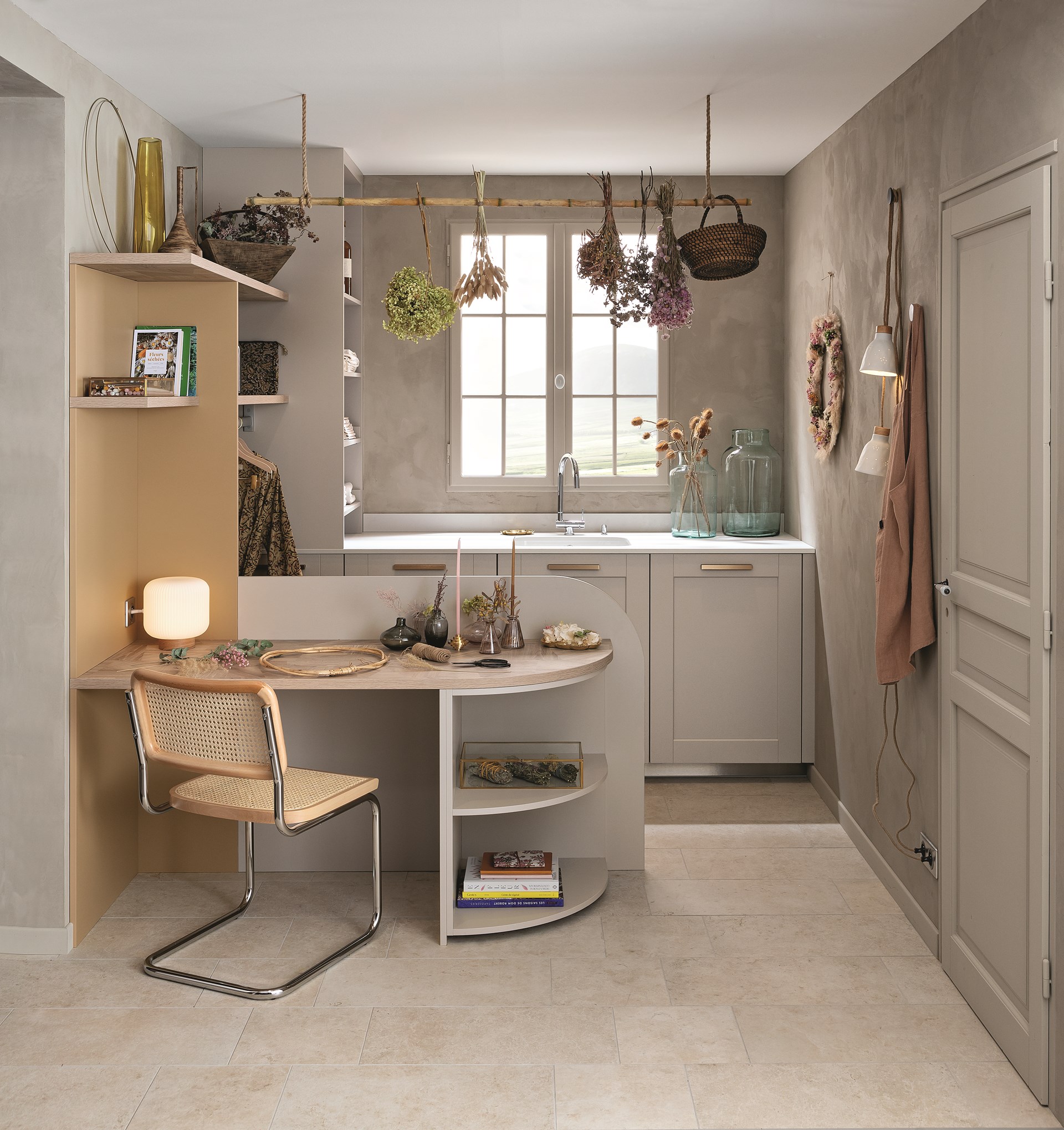 Dans les mêmes matériaux et teintes que la cuisine, la buanderie Bucolique apporte un nouveau souffle à la maison. Un espace fonctionnel qui cache bien son jeu ; à la fois cellier, penderie et atelier/bureau, cette pièce recèle de nombreux atouts grâce à l’optimisation des mètres carrés. La buanderie se distingue par son agencement intelligent, dissimulant l’électroménager derrière les façades et en créant une niche avec coulissants pour un accès aisé aux produits d’entretien ou linge de maison. Conçu pour anticiper l'humidité fréquente de cette pièce de vie, le design sur-mesure prend en compte chaque détail. Il suffit par exemple d'abaisser le mitigeur de l'évier, ajustable en position, pour ouvrir en grand les fenêtres (photo à l’appui). Comme dans l’entrée, le coin bureau se pare d’un plateau effet bois de chêne fragmenté, arrondi pour fluidifier le passage vers la buanderie. Sous le plan de travail, des niches ouvertes à la fois décoratives mais aussi fonctionnelles pour ranger boites et ustensiles.