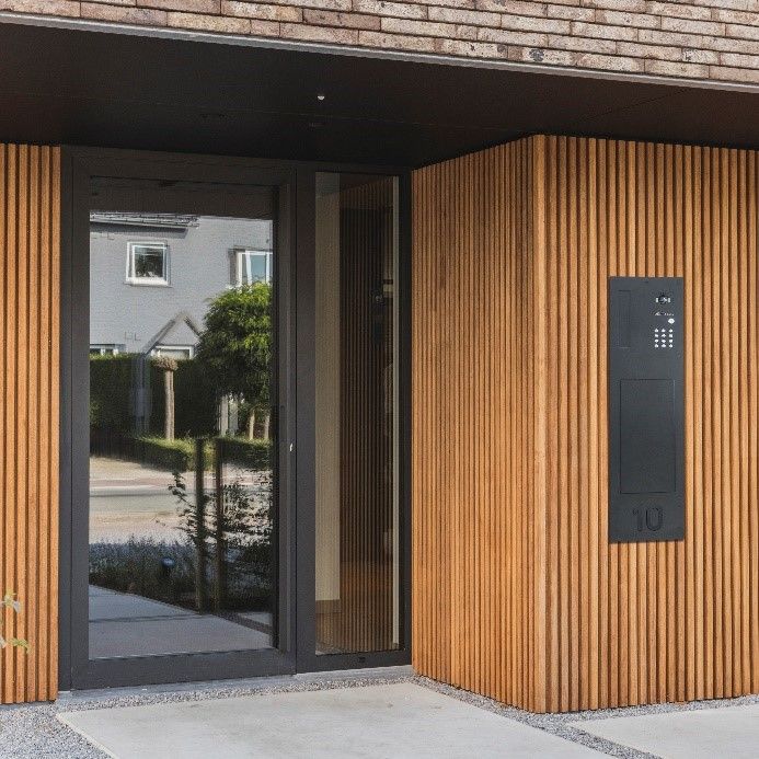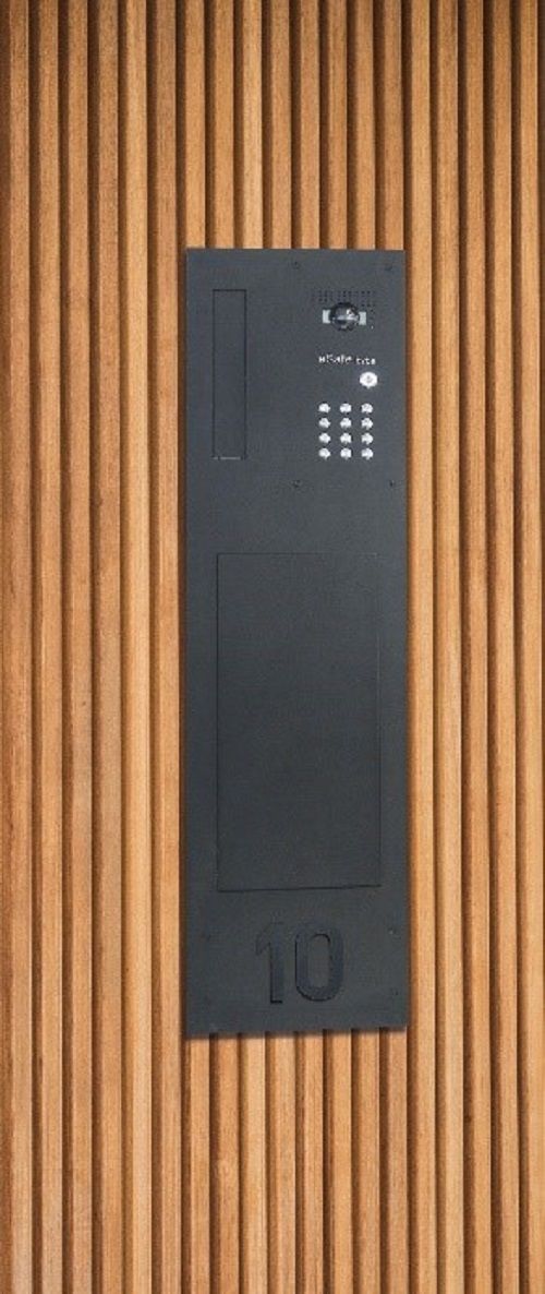 La boîte à colis – disponible en différentes dimensions – est un des éléments disponibles de ce concept global qui s’intègre dans un mur ou un portail de jardin. Un numéro de maison, une boîte aux lettres, une sonnette, un vidéophone et/ou un clavier numérique font partie des possibilités. Le tout intégré dans un même panneau. Vous pouvez ouvrir le portail ou la boîte à colis aussi bien à l’aide du vidéophone que du clavier numérique.