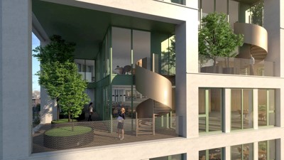 La matérialité et l’articulation des façades jouent un rôle clé dans le langage architectural du projet. Les étages inférieurs, transparents et accueillants, favorisent l’interaction avec la rue. En hauteur, la façade devient progressivement plus dense et sobre, mettant en avant des notions de durabilité et de robustesse. Des fenêtres cintrées de double hauteur interrompent cette structure, créant des espaces multifonctionnels favorisant flexibilité, collaboration et créativité. Ces éléments constituent une alternative aux aménagements de bureaux traditionnels, tout en renforçant le sentiment de communauté.