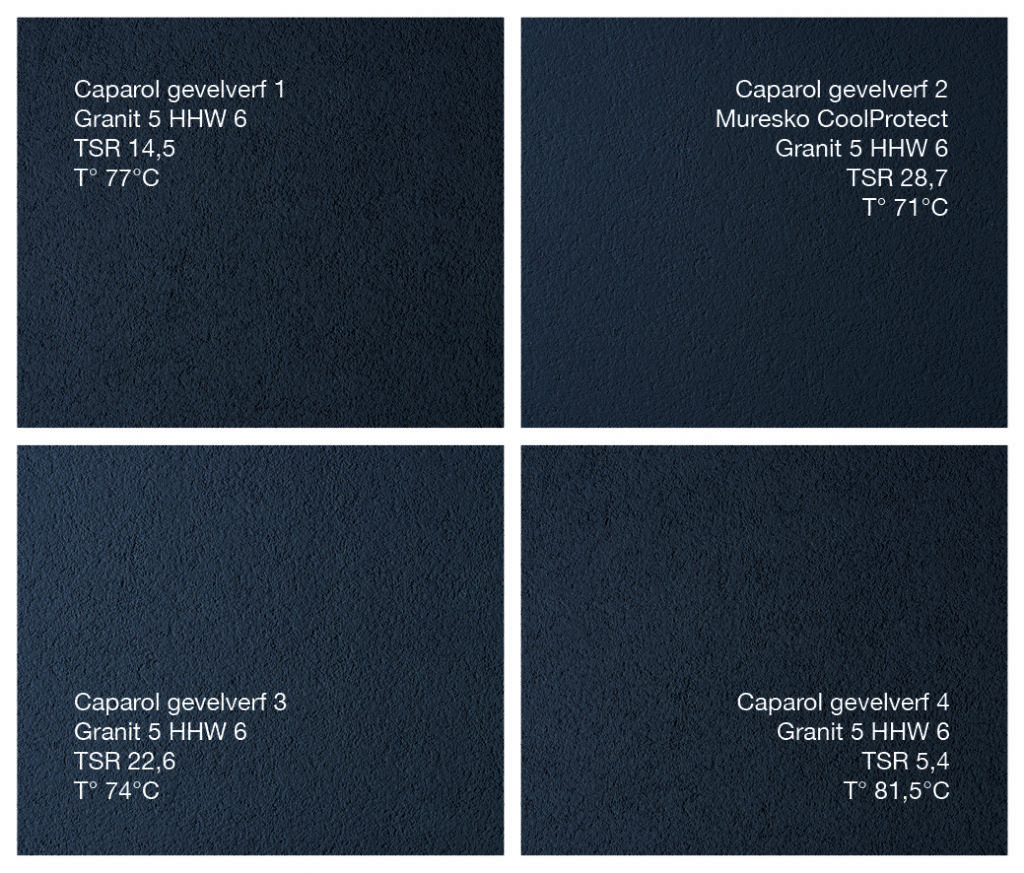 Muresko CoolProtect de Caparol est une peinture de façade à base de résine silicone qui diminue le réchauffement thermique de la surface de la façade. Une propriété très pratique lorsqu'on applique des couleurs foncées sur des surfaces isolées telles que ETICS ou béton cellulaire. La composition particulière des pigments permet un léger réchauffement par l'action des rayons du soleil qui, à côté de la lumière solaire visible, reflète aussi une grande part de la gamme proche de l'infrarouge.