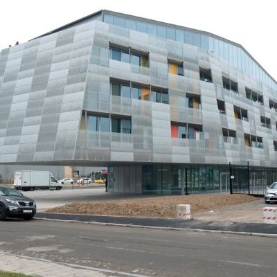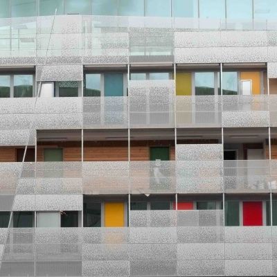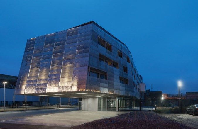 Véritable prouesse architecturale du bureau Jourdain Architectes Associés, le bâtiment a été conçu de manière à libérer le rez-de-chaussée pour offrir depuis la rue une vue sur le parc urbain situé à l’arrière du bâtiment. Celui-ci peut dès lors être perçu aisément depuis la voirie et le futur rond-point, créant ainsi une liaison verte dans la ville. La façade, habillée d’un revêtement métallique perforé de manière variable apporte confort lumineux et sécurité, renforce le caractère moderne de l’édifice et rappelle le passé sidérurgique de la ville. Ce revêtement permet à la fois de protéger les habitants du soleil, de libérer les vues et les balcons et d’intégrer la fonction de garde-corps. Le choix du métal et la complexité des percements d’apparence aléatoire constituent une recherche en rapport avec la tradition métallurgique de la région. Derrière la paroi métallique, en second plan, les menuiseries rythmées par un jeu de couleurs viennent affirmer le corps principal et la structure du bâtiment.