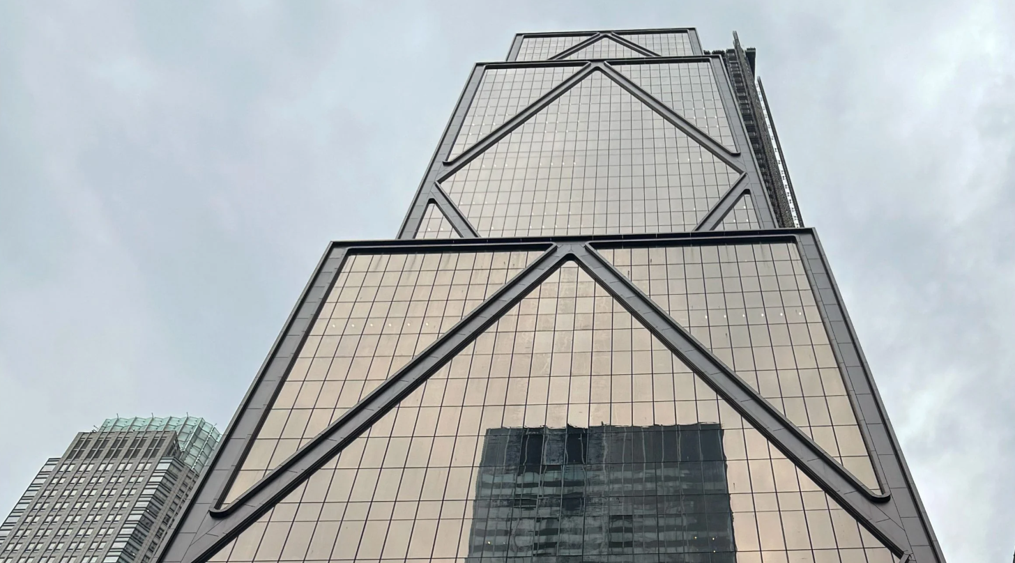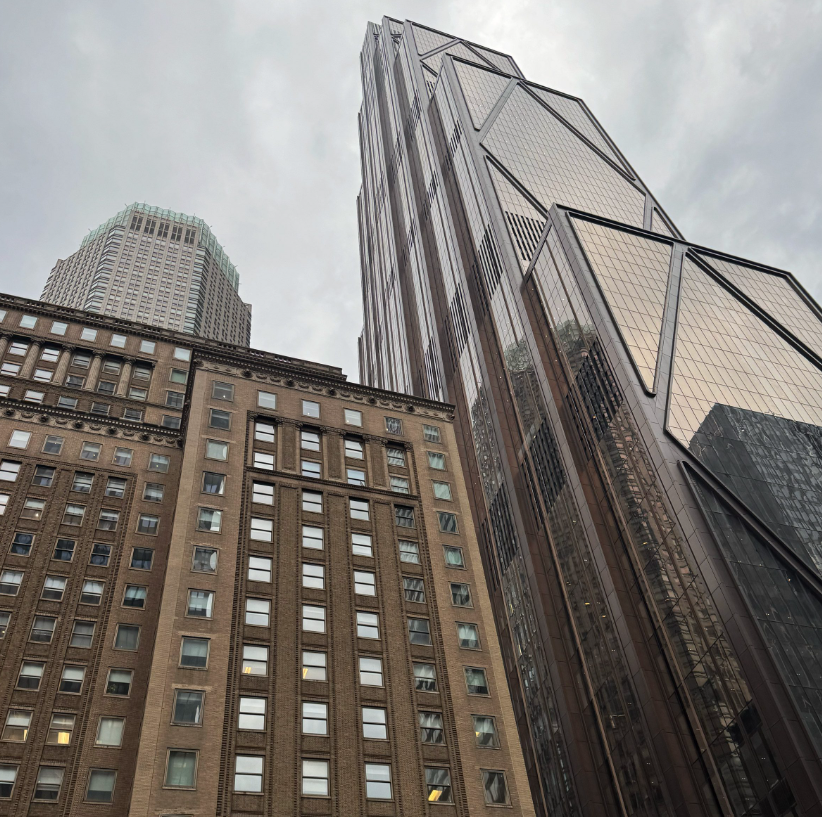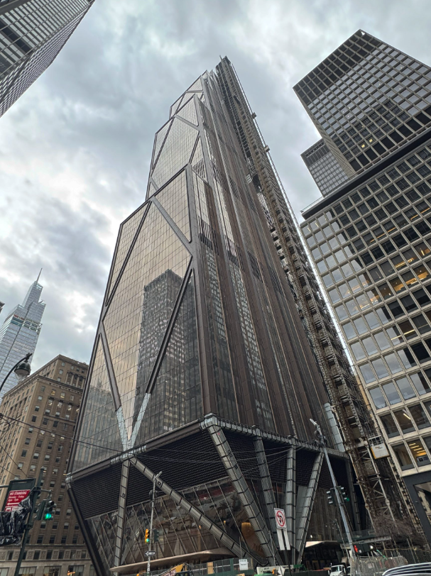 Remplaçant l’ancien bâtiment Union Carbide – démoli en 2021 et conçu par SOM – la tour se distingue par ses volumes audacieux : quatre retraits en gradins mènent à un sommet élancé, tandis que sa base repose sur un système de colonnes en éventail combinées à des contreventements triangulaires visibles en façade. Cette approche structurelle permet de dégager un imposant lobby de 24 mètres de haut (80 pieds), tout en reculant significativement le bâtiment par rapport à la rue.