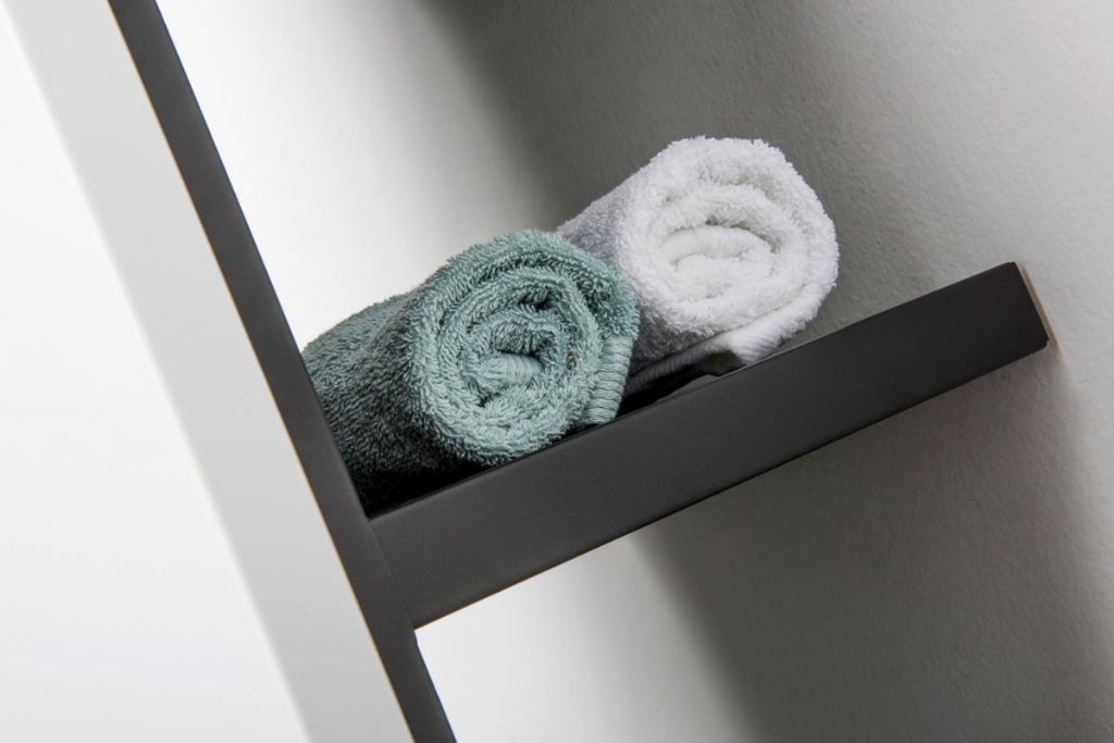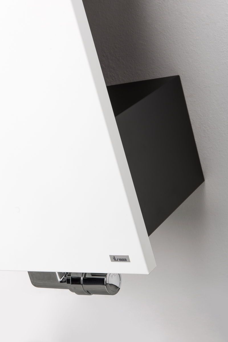 Le nouveau radiateur de salle de bains est situé à plus de 30 cm du mur, de sorte qu'il y ait de la place à l'arrière pour plus de fonctionnalité. Niva Bath est l'aide idéale pour le séchage des essuies ou le préchauffage des pyjamas, car Vasco a développé un design astucieux avec porte-manteaux et étagères intégrés, complètement hors de vue. Seuls la large étagère du bas et le support télescopique en inox doivent être fixés au mur.