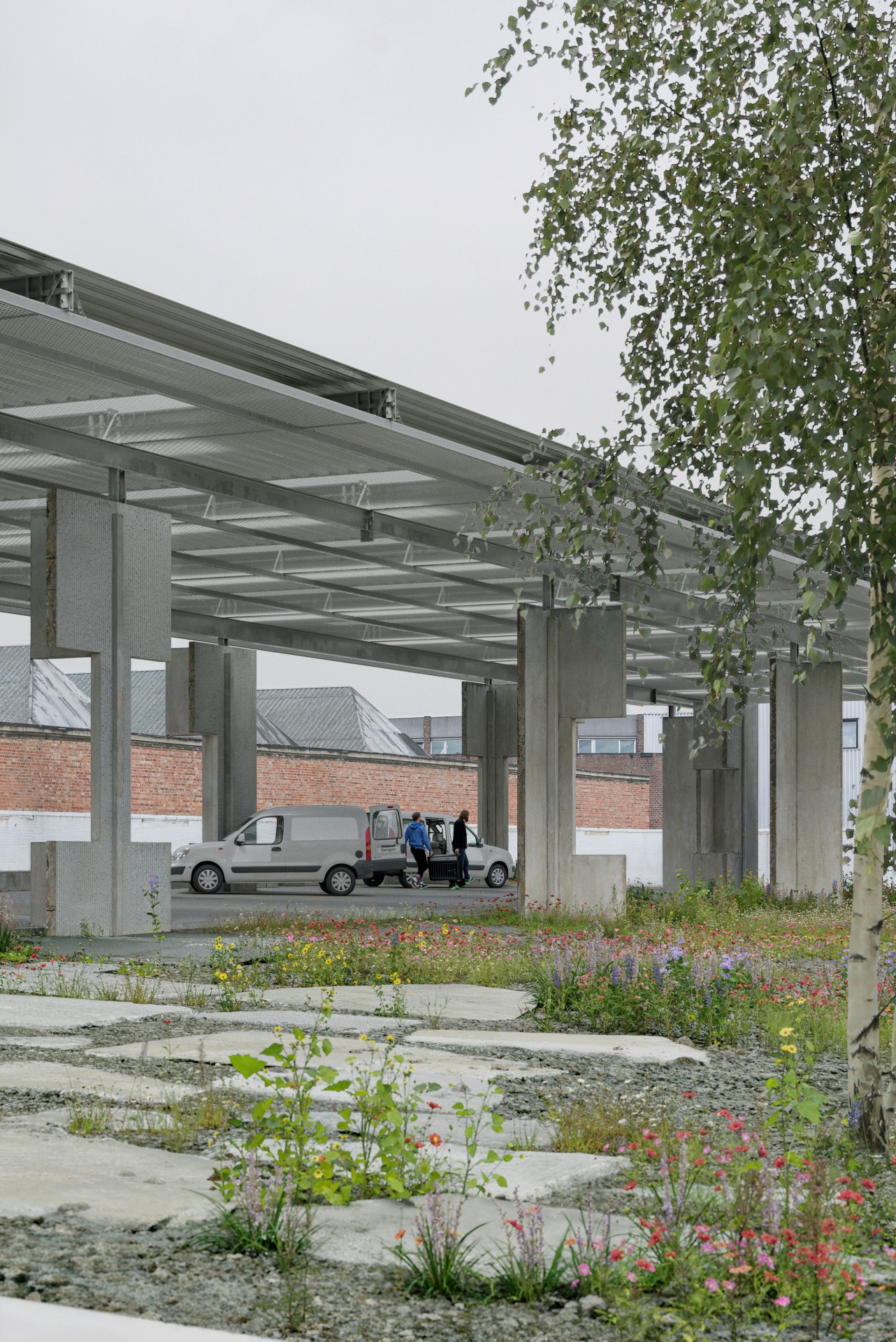 La proposition de Babini Geysen et TEN part d’une lecture active du site existant, situé à la frontière entre un quartier résidentiel et le tissu industriel restant de Jette. L’équipe gagnante considère cette situation hybride non pas comme un problème, mais comme un potentiel. Les bâtiments présents sont envisagés comme des ressources spatiales ou matérielles. Ce qui est solide et porteur de caractère – comme les bâtiments d’angle en béton à arcades – est conservé et réaffecté. Ce qui est léger et facile à démonter – comme les hangars métalliques – est soigneusement démonté et transformé en nouveaux éléments constructifs.