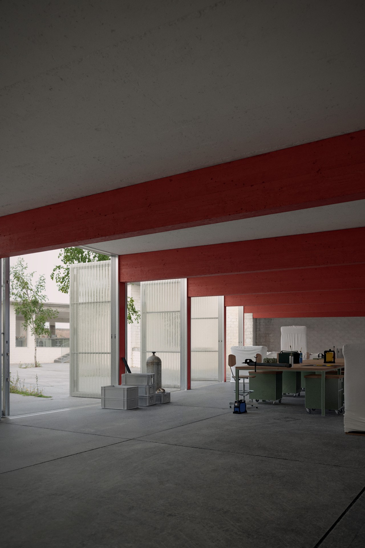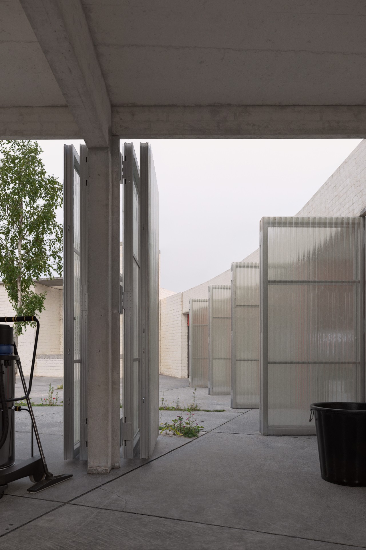 Cette approche axée sur le matériau donne lieu à une stratégie à la fois marquante et cohérente : une nouvelle couverture au-dessus du quai de déchargement est entièrement construite à partir d’éléments récupérés sur place. La structure métallique des hangars, les panneaux de béton, les parements de façade – tous retrouvent une nouvelle vie dans une structure robuste mais modulable. Cette couverture n’est pas qu’un simple auvent : elle est une promesse structurelle pour l’avenir, extensible, adaptable, voire transformable en bâtiment.