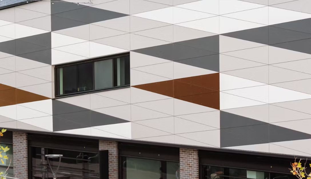 Rockpanel se distingue par ses façades avant en bardage extérieur, composées de triangles et de losanges, qui créent un jeu de profondeur et un motif visuellement accrocheur. Les panneaux utilisent une gamme de couleurs et de finitions, y compris des gris assortis et une finition unique de la gamme Chameleon, qui change d'aspect selon l'angle de la lumière et le point de vue de l'observateur. Cette innovation souligne la capacité de Rockpanel à allier esthétique et performance.