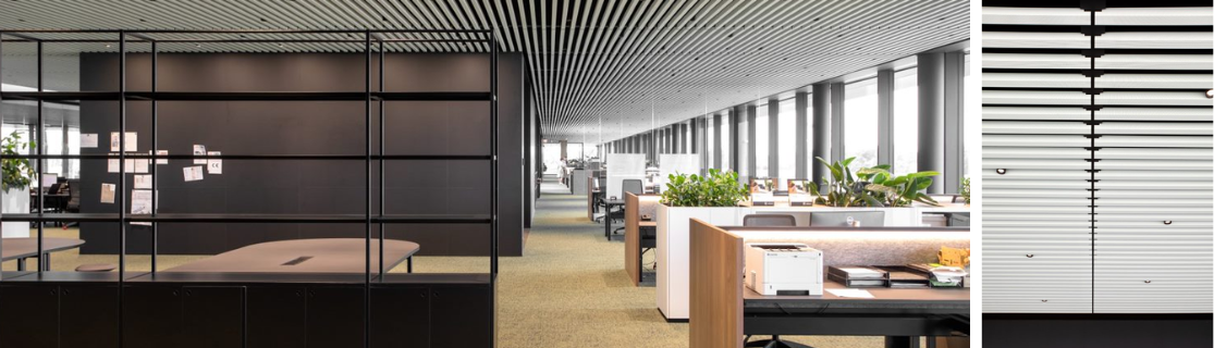 Le Vektron ili est disponible en deux configurations différentes. Les deux consistent en la même grille de support, mais la taille des panneaux varie. La plus petite bande a une largeur de 50 mm et un pas de 130 mm. Elle apporte une touche délicate et élégante au plafond. Les plus grands verrous ont une largeur de 180 mm et un espacement deux fois plus grand. Cela donne à l'espace de bureau un aspect plus robuste.