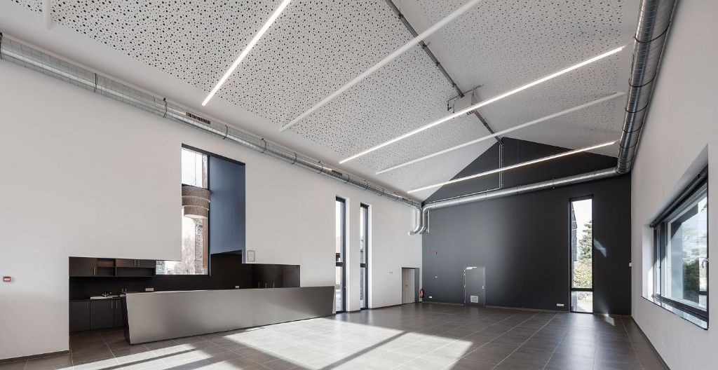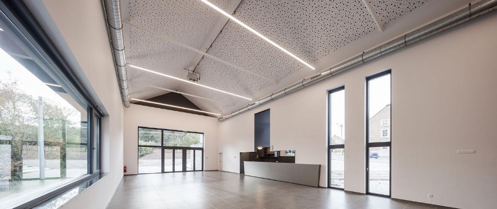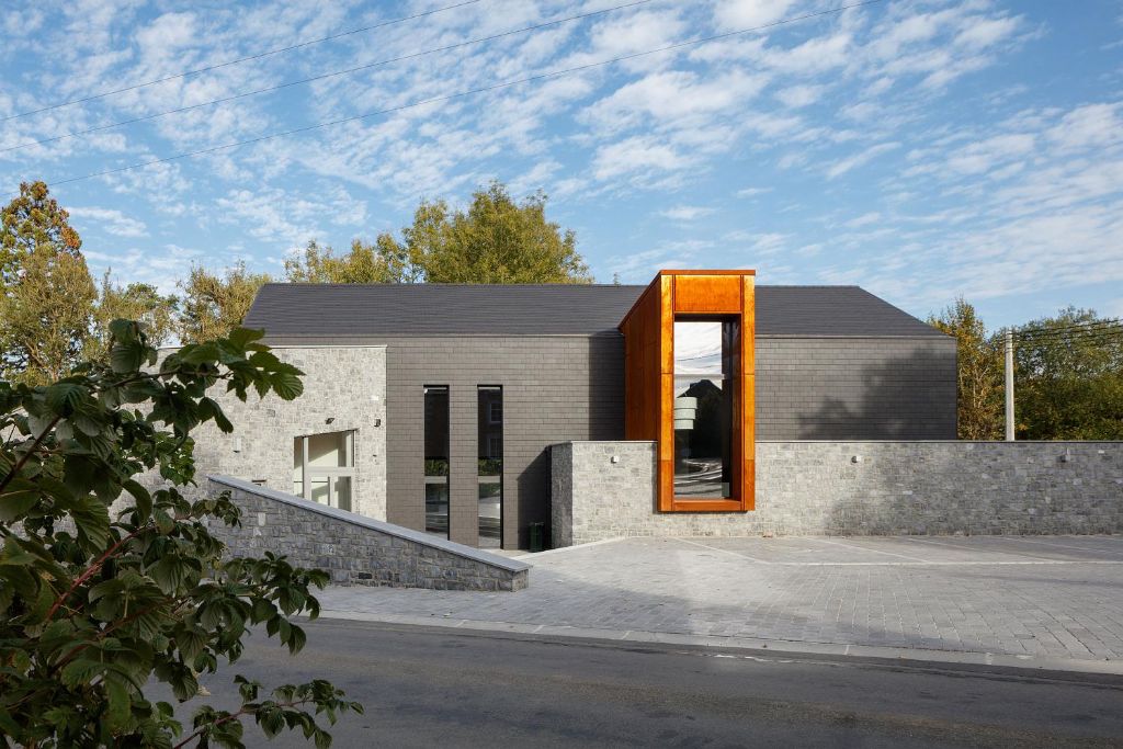 Alors que l’ancienne salle était implantée en recul de la parcelle, la nouvelle salle a été implantée au carrefour des rue d’Aye et de Borzillieux. Cette implantation permet de structurer le village en créant un effet de porte. Cela permet également de sécuriser le carrefour en le réduisant et en le redéfinissant clairement, tout en intégrant la différence de niveau. Enfin, cette implantation rationalise l’espace en dégageant un espace libre permettant l’aménagement d’abords plus intéressants : terrasse dans le prolongement de la salle, zone de jeux, zone de parkings, … A l’intérieur, la nouvelle salle offre une capacité d’accueil importante et propose un beau grand volume, mis en évidence par l’apport de lumière naturelle.
