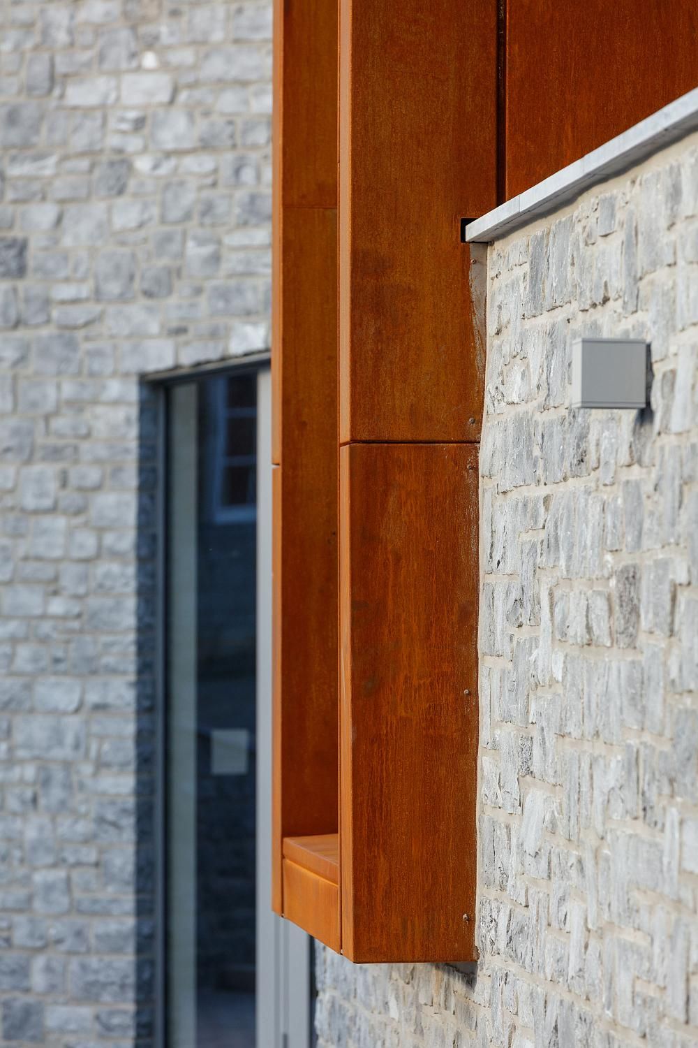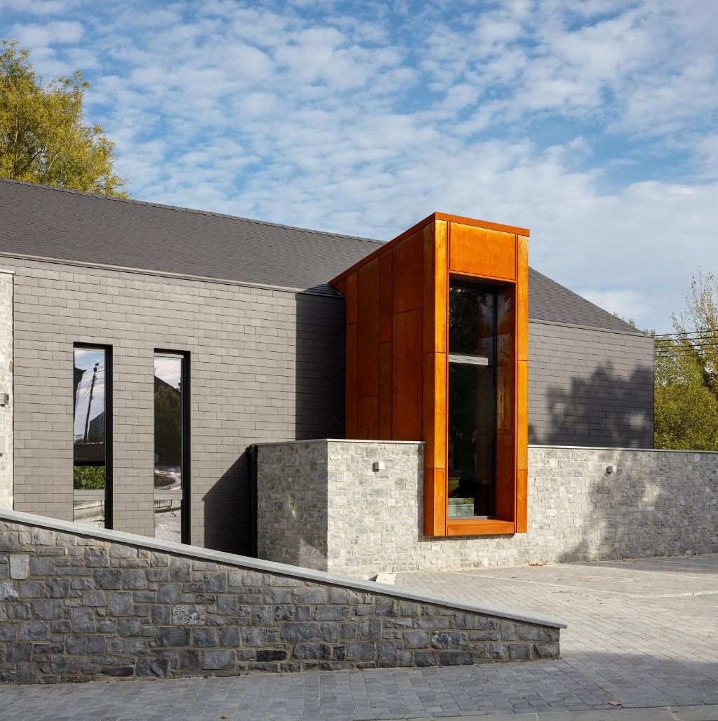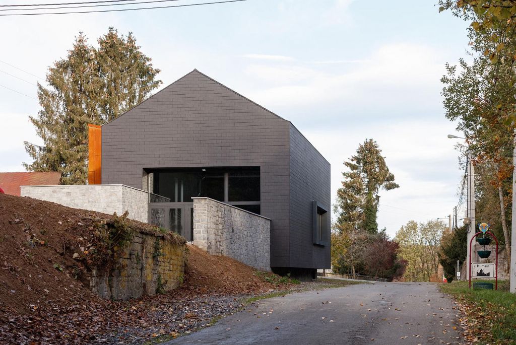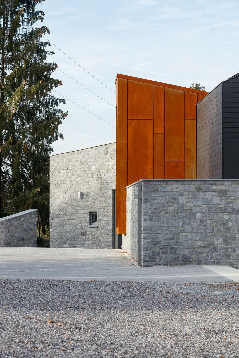 Le volume principal, accueillant la salle, est traité à toiture à versant afin de s’inscrire au mieux dans l’environnement paysager. Les fonctions annexes sont traitées en volumes secondaires à toiture plate permettant de redéfinir le carrefour et de gérer la différence de niveau par la création d’un mur de soutènement. La volumétrie du bar amène de la verticalité et du dynamisme complémentaire au projet. La tuile plate en terre cuite foncée est utilisée pour les bardages et la toiture de la salle, offrant une lecture claire de la volumétrie principale. Ce matériau s’harmonise avec les parements en pierre calcaire, sablée, des volumes secondaires, qui permettent d’accentuer l’ancrage du projet dans le contexte bâti. Enfin, la verticalité de la lucarne du bar est soulignée par l’utilisation de l’acier corten, offrant à la fois contraste et harmonie au projet final.