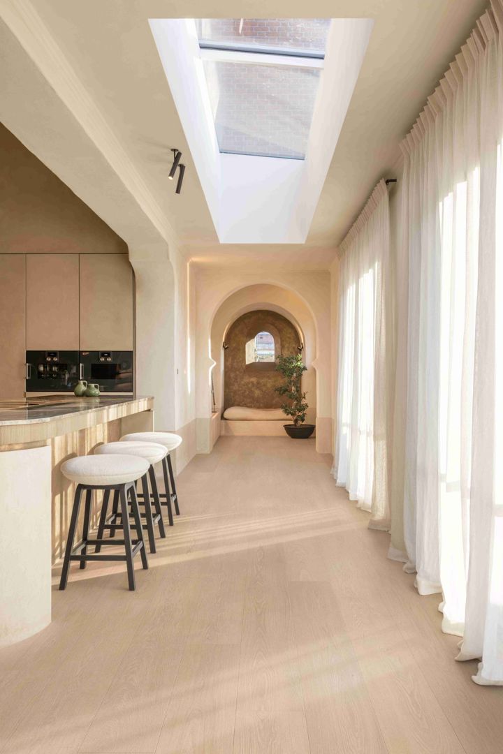 « Les lames mesurent pas moins de 2,1 mètres de long. C’est exceptionnel pour un sol clipsable », explique Stijn Windels, Marketing & Product Director de Coretec Floors. La nouvelle collection propose en plus des lames extra larges. « Pas moins de 30,5 centimètres. Cela accentue encore davantage le look haut de gamme », souligne fièrement Windels. Une telle longueur et largeur nécessite un bon soutien. C’est possible grâce au noyau extra épais. À cela s’ajoute une protection luxueuse avec une couche d’usure de 0,8 mm, soit 60 % plus épaisse que celle des autres collections. Ce sol allie des dimensions remarquables à une durabilité exceptionnelle.