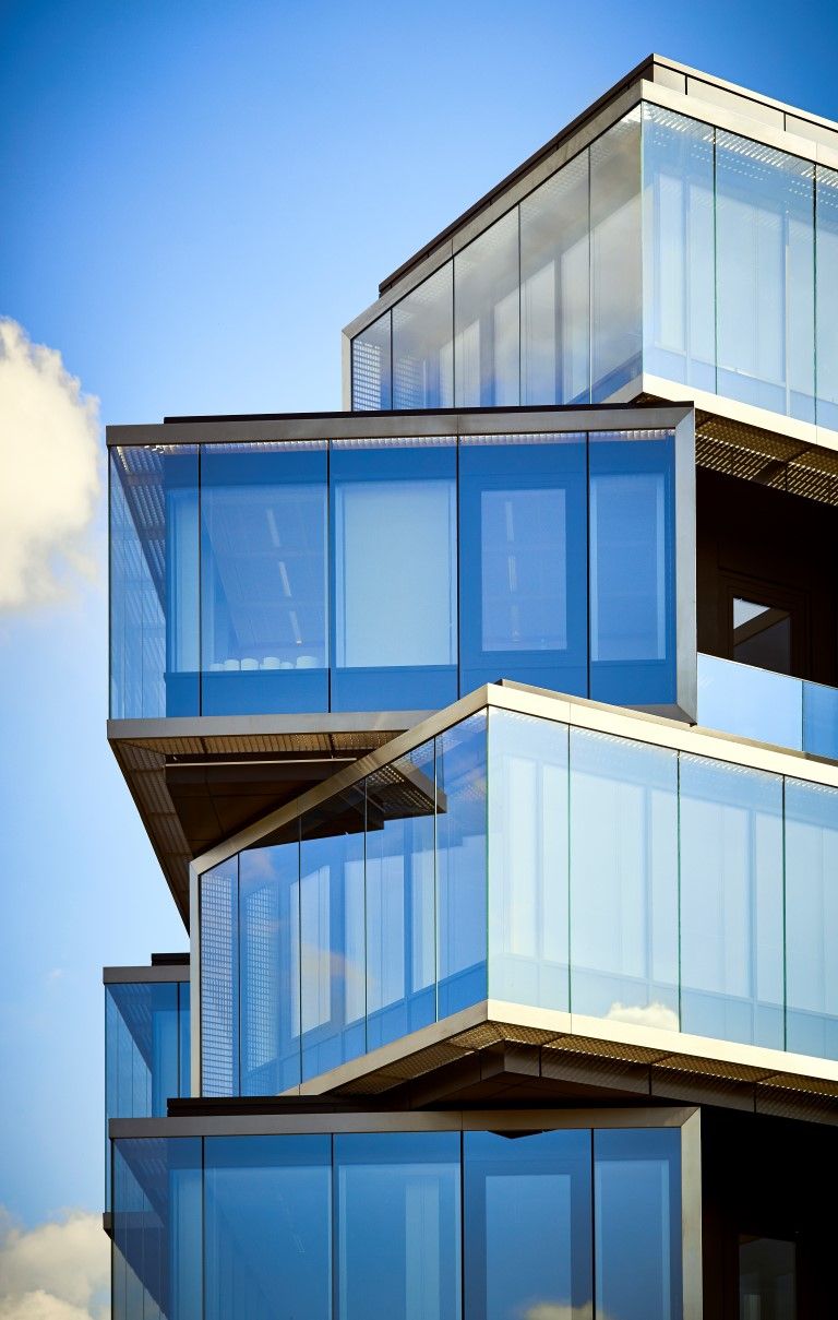 Les demi-ailes de plateaux de bureaux ont été voulues les plus homogènes possible, suivant une modulation de la trame de 1,25 m. La structure épouse la façade : on ne trouve donc pas de poteaux venant empiéter sur la surface aménageable. La façade de verre et d’inox déborde d’un étage à l’autre, chaque étage faisant 2,60 m de hauteur libre (2,90 m au rez-de-chaussée), tandis que l’économie de linteaux laisse entrer un maximum de lumière naturelle. En résultent des espaces de bureaux ultra-flexibles et agréables à vivre. Pour éviter la délicate rencontre des façades à la pointe du bâtiment, des terrasses y ont été prévues. Une seconde peau vitrée pincée fait office de protection solaire. Des stores intérieurs sont également présents.