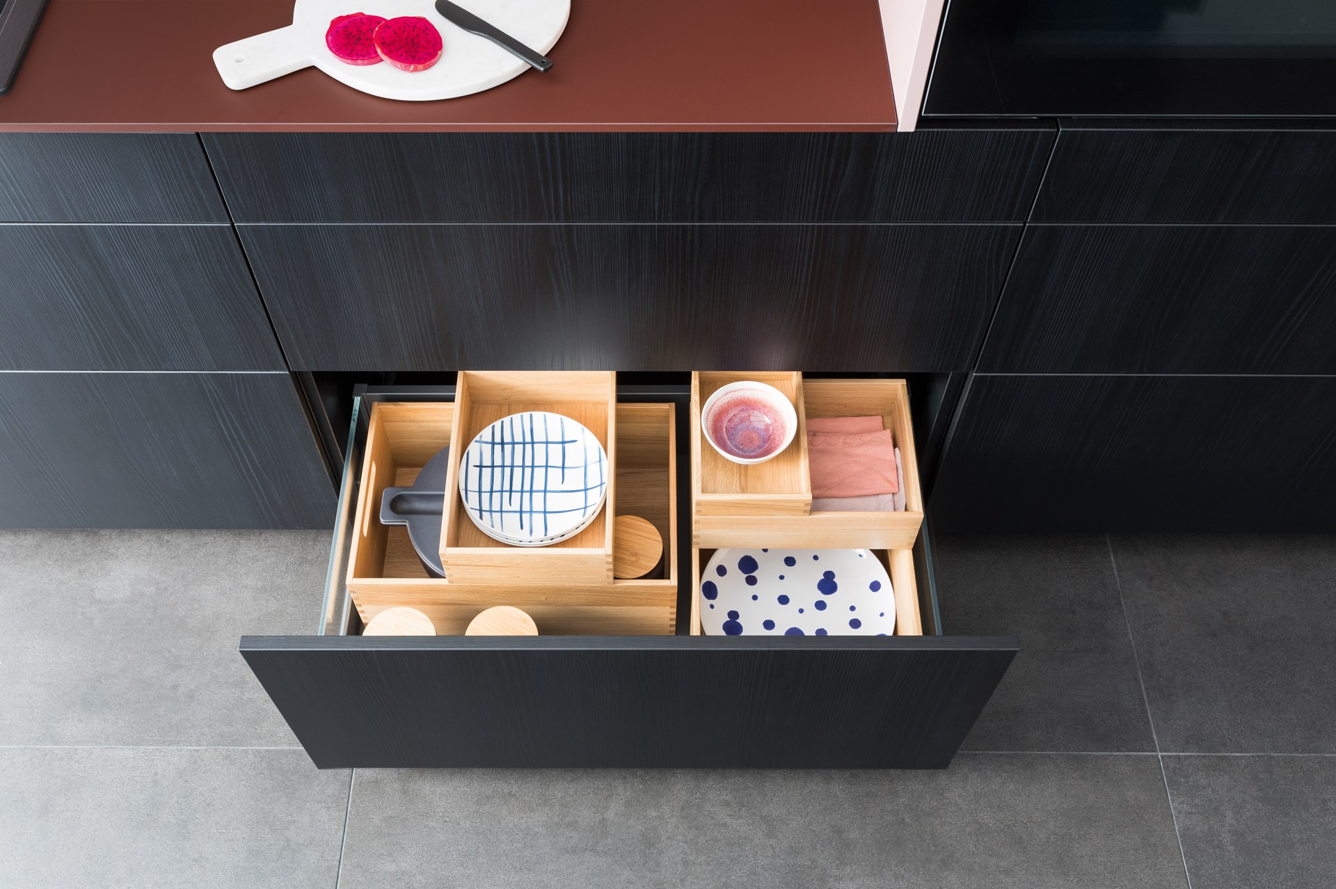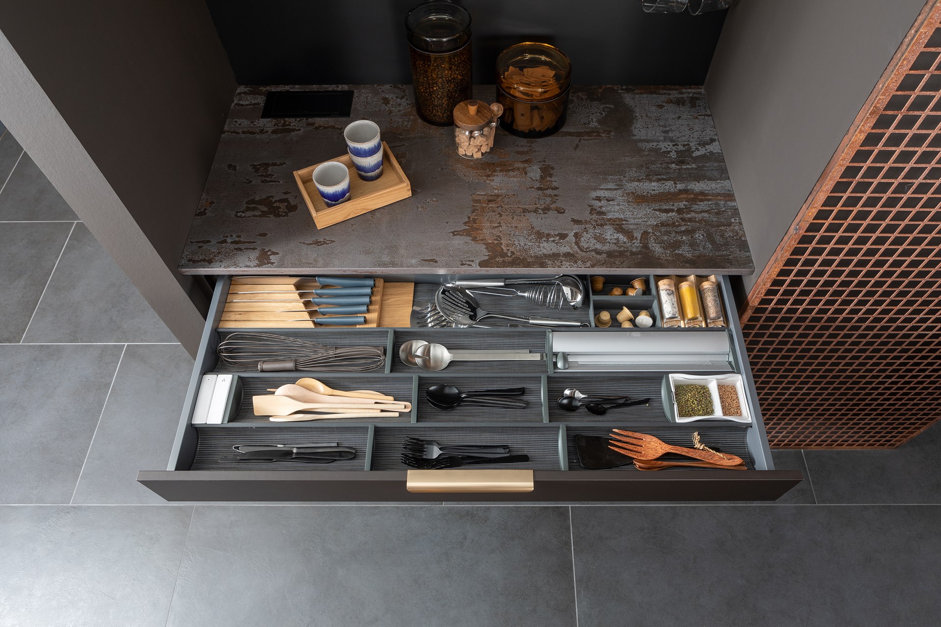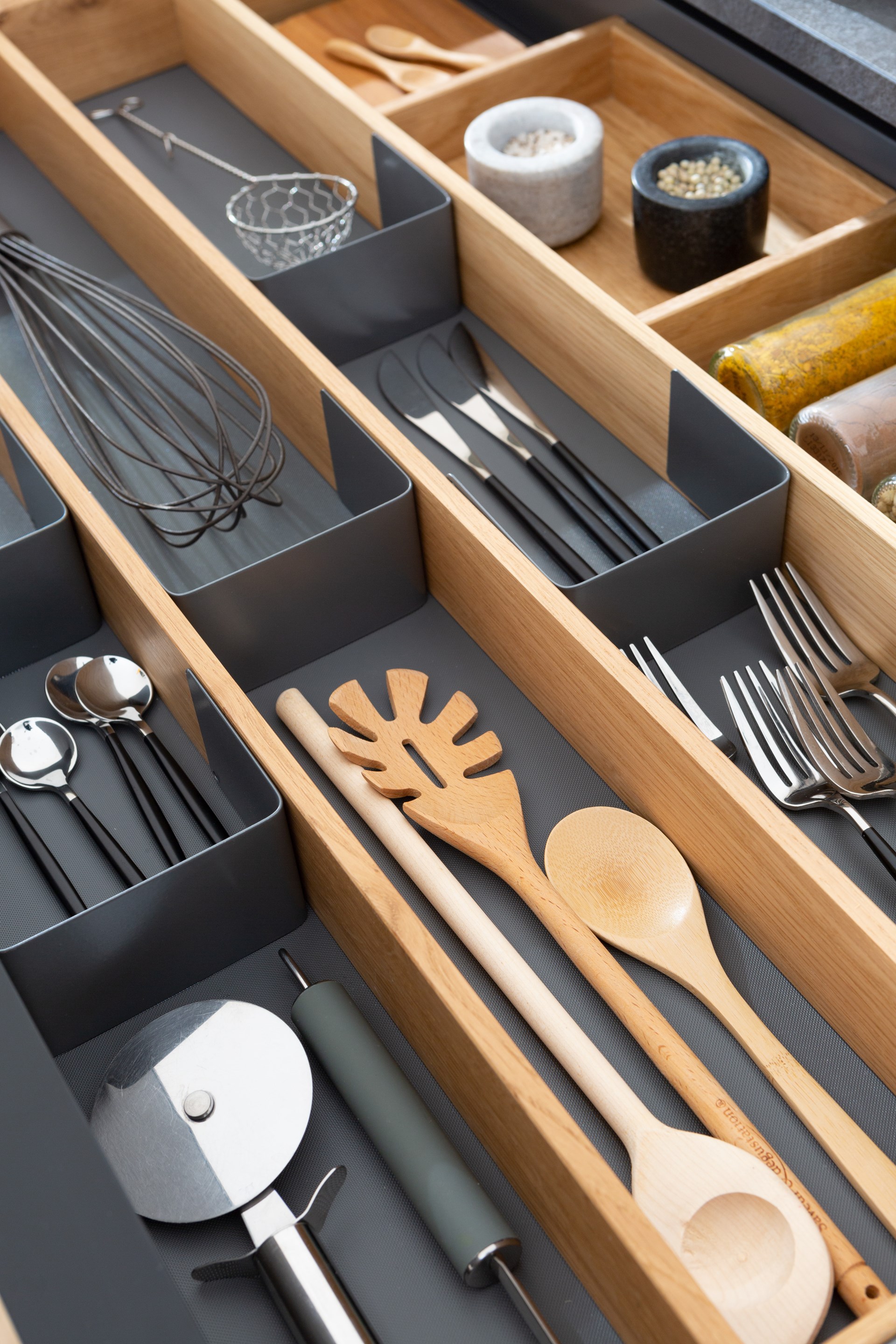Mobalpa se distingue par l'élégance et la praticité de ses options de rangement. Les tiroirs sont dotés d'alvéoles modulables, permettant un aménagement optimal des couverts. Selon la configuration de l’agencement, la marque peut également intégrer des meubles de faible profondeur en crédence, qui grâce à leurs portes coulissantes, dissimulent avec raffinement la verrerie ou les carafes. Les boîtes amovibles de la gamme Woodtrend, conçues en bois naturel, apportent une touche de raffinement supplémentaire tout en offrant une organisation fonctionnelle des tiroirs.