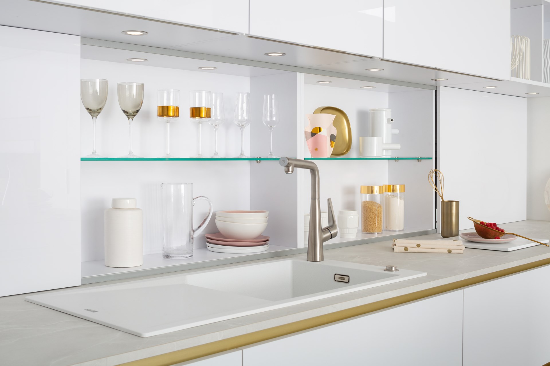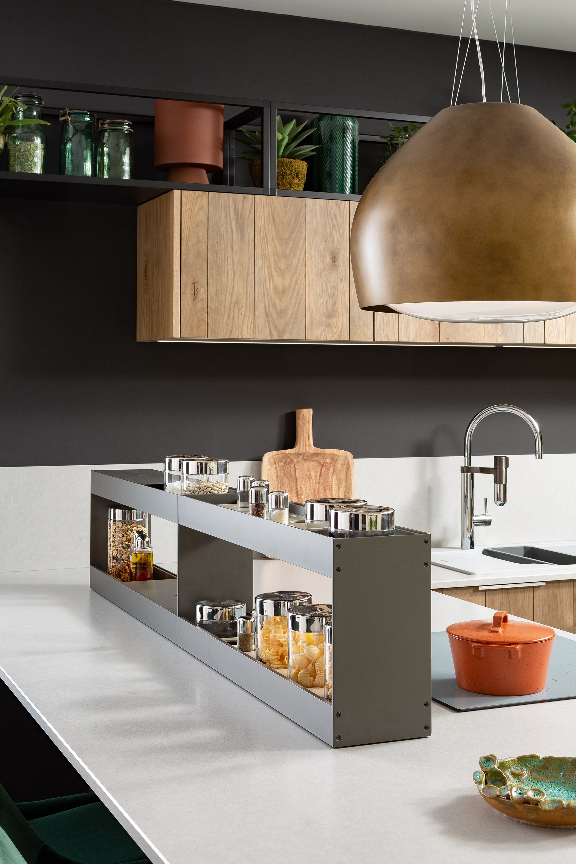 L'organisation des espaces ouverts tels que les étagères, les niches et le plan de travail est tout aussi importante que celle des placards et des tiroirs. S’offrant au regard, ils se doivent d’être impeccables !