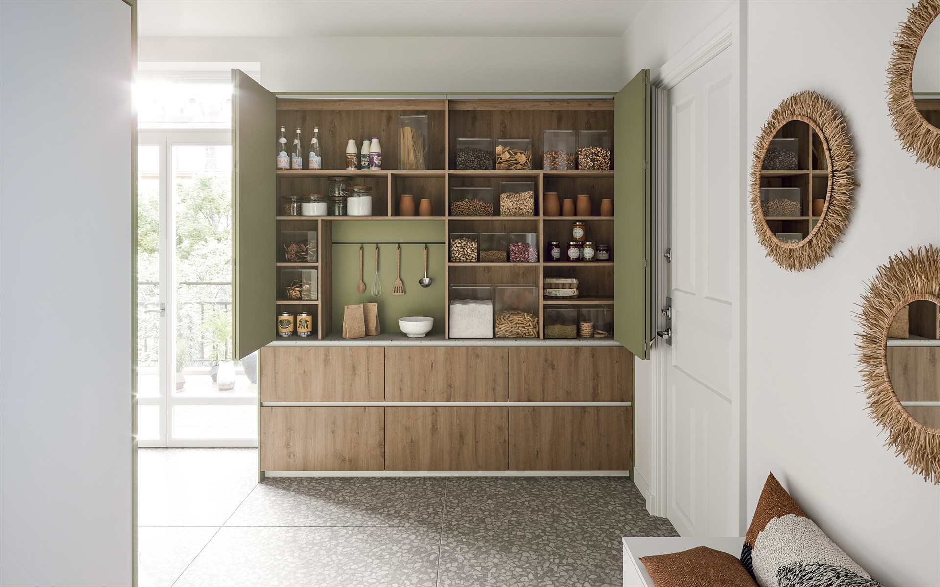 - Des rangements de contreporte optimisent l'espace et gardent les produits fréquemment utilisés à portée de main.