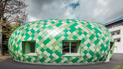"Les produits PREFA sont très agiles lorsqu'il s'agit de concrétiser des idées et des visions architecturales", explique Martin Armingeat. Il est architecte et chef de projet. Stephan Ruck, l'un des chefs d'entreprise et partenaire de Raimond SAS, qui est intervenu en tant qu'artisan expérimenté dans le projet de la façade inhabituelle et incurvée, le sait également. Son entreprise est connue pour réaliser des perforations et des formes artistiques dans des couleurs souvent vives. En raison de la vaste palette de couleurs et des propriétés des matériaux, il apprécie de travailler avec Falzonal, les boucles de toit et de façade de PREFA. "Nous avons accepté la commande de Marly-le-Roi en partie parce que le bâtiment a une forme très particulière. Un tel projet est l'occasion pour nos collaborateurs d'apprendre beaucoup en termes de planification, d'ingénierie et d'exécution", explique M. Ruck.