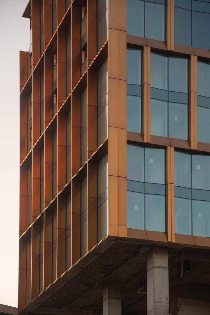 La transformation du bâtiment s’est matérialisée par plusieurs interventions majeures, comprenant notamment l’extension latérale des ailes pour accueillir de nouvelles fonctions, la surélévation de deux étages pour préserver les proportions originales, et le remplacement intégral de l’enveloppe par une façade performante et modulaire aux reflets cuivrés qui capte la lumière et dynamise l’espace public.