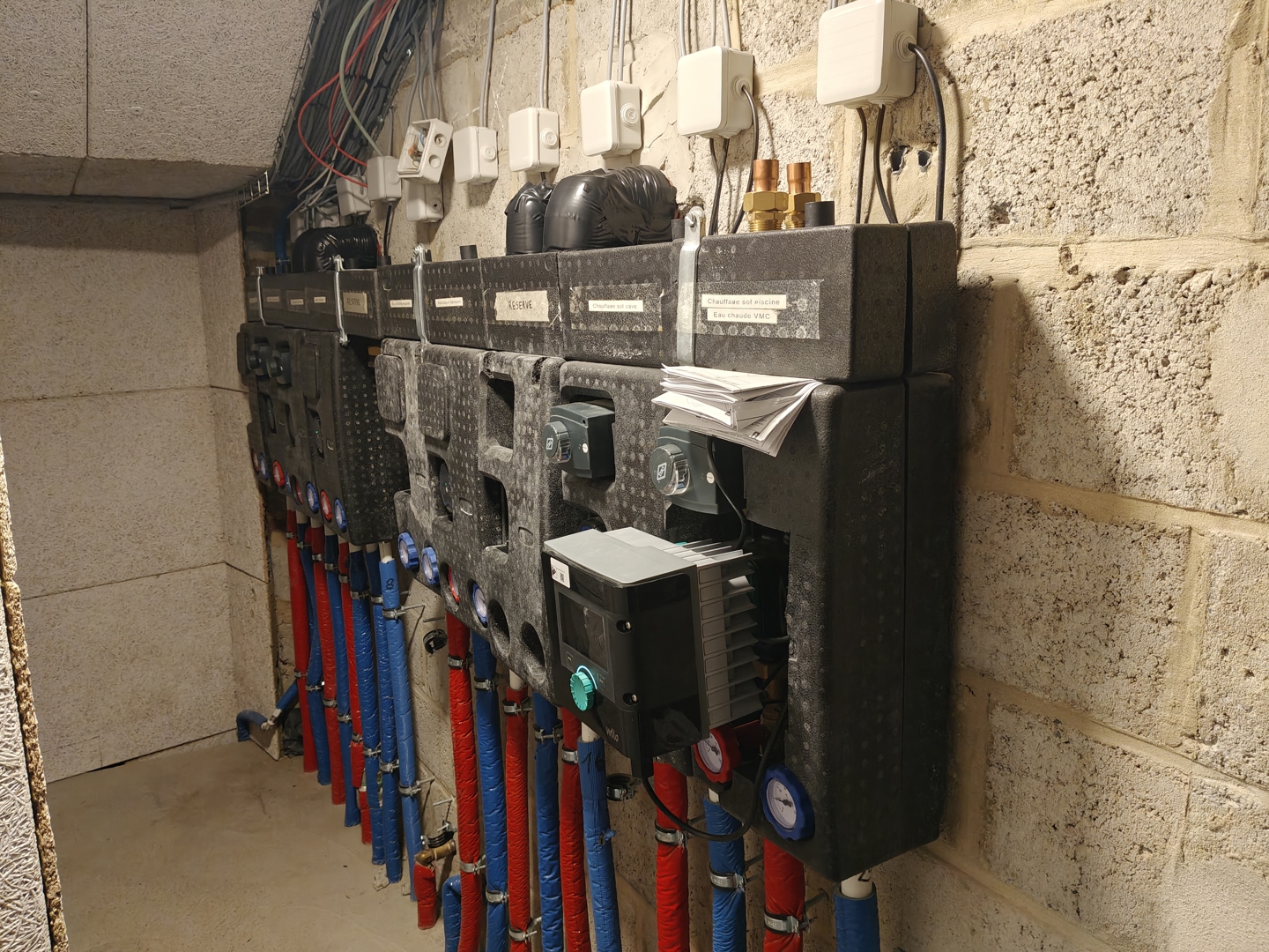 Sur le plan hydraulique, le système repose sur 13 sondes géothermiques verticales reliées à une bouteille de découplage, puis distribuées vers les deux pompes à chaleur STIEBEL ELTRON. La machine « basse température » alimente le chauffage sol des pièces de vie et des chambres, ainsi que les réseaux de ventilation, tandis que la « haute température » prend en charge des besoins plus spécifiques : production d’eau chaude sanitaire, chauffage de l’espace piscine et du bassin, ainsi que quelques radiateurs conservés dans le bâtiment. Des ventilo-convecteurs ont également été ajoutés pour assurer le refroidissement de certaines zones sensibles, comme la cave à vin.