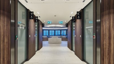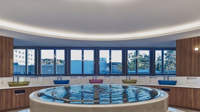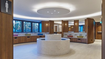 Le nouveau design met en valeur la haute qualité du bâtiment avec son agencement généreux d'espaces, son langage formel ainsi que des matériaux de haute qualité et un éclairage d'ambiance. Parallèlement, des systèmes de séparation et une structuration intelligente ont été mis en place pour garantir un niveau élevé de fonctionnalité : des vestiaires ou des espaces familiaux, un espace avec des miroirs de maquillage et une installation d'eau au centre de la salle de lavage ronde créent une atmosphère accueillante. De plus, les surfaces robustes et faciles d'entretien des matériaux en bois utilisés garantissent que les nouvelles installations sanitaires sont faciles à nettoyer et restent durablement attrayantes.