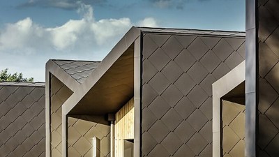 La pose des toitures et façades en aluminium brun noisette a été réalisée par Gilles Esnault et son équipe de Tallot Couverture. Sur une surface de près de 3 000 m², plus de 15 000 losanges de toiture et de façade PREFA 44 × 44 ont été installés par une équipe de cinq à six couvreurs, pour un total d’environ 3 650 heures de travail. L’accent a été mis sur la continuité, avec une disposition précise afin de maintenir une certaine uniformité. L’absence de profils de finition sur le faîtage permet également de préserver une apparence uniforme. Les ajustements apportés au bâtiment existant ainsi que l’installation de plusieurs fenêtres de toit ont exigé une attention particulière de la part des artisans sur place. « En tant que couvreur ou ferblantier, il est essentiel de savoir concilier deux compétences : une planification méticuleuse en amont et la capacité à s’adapter aux imprévus sur le chantier. »