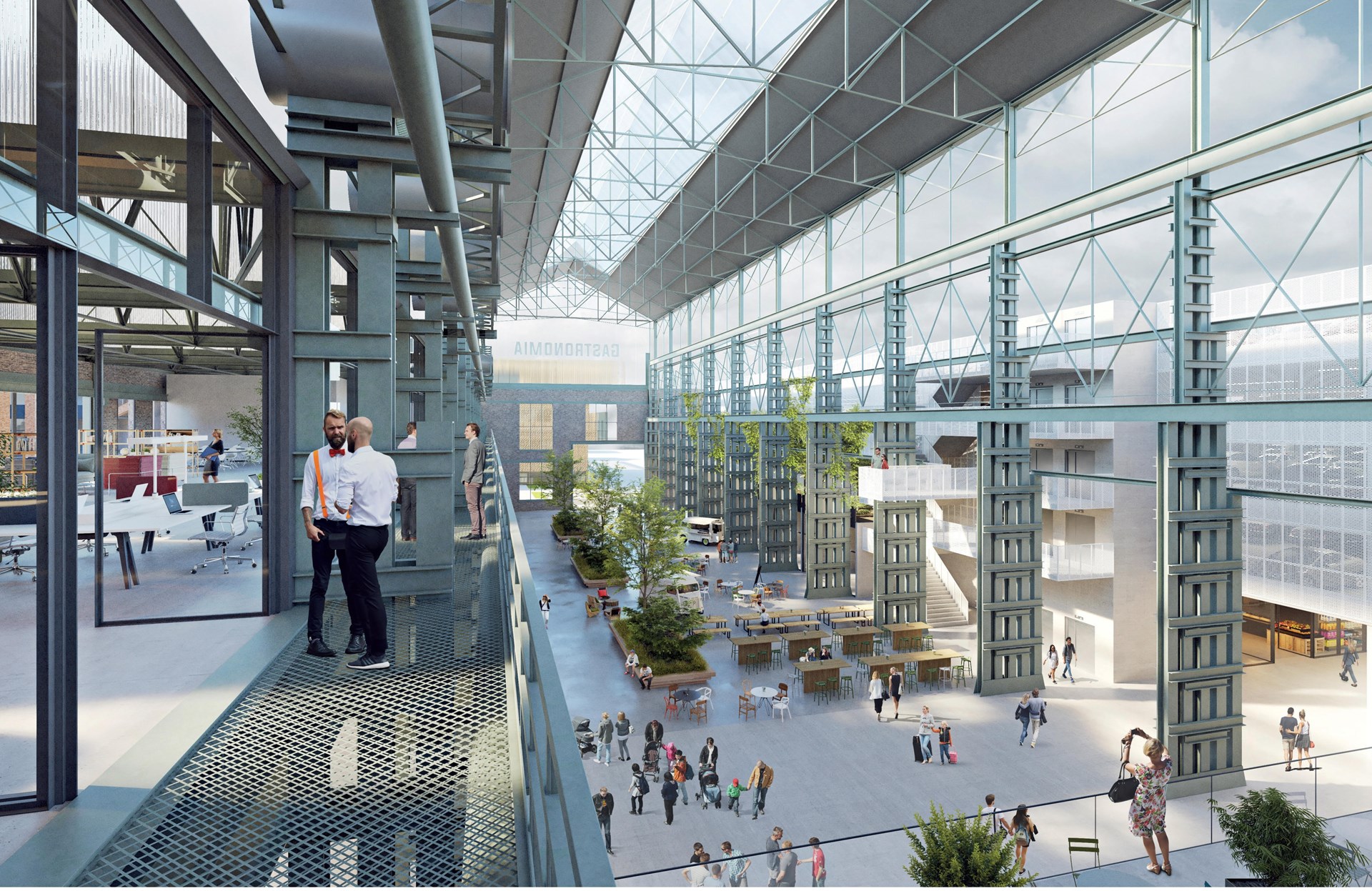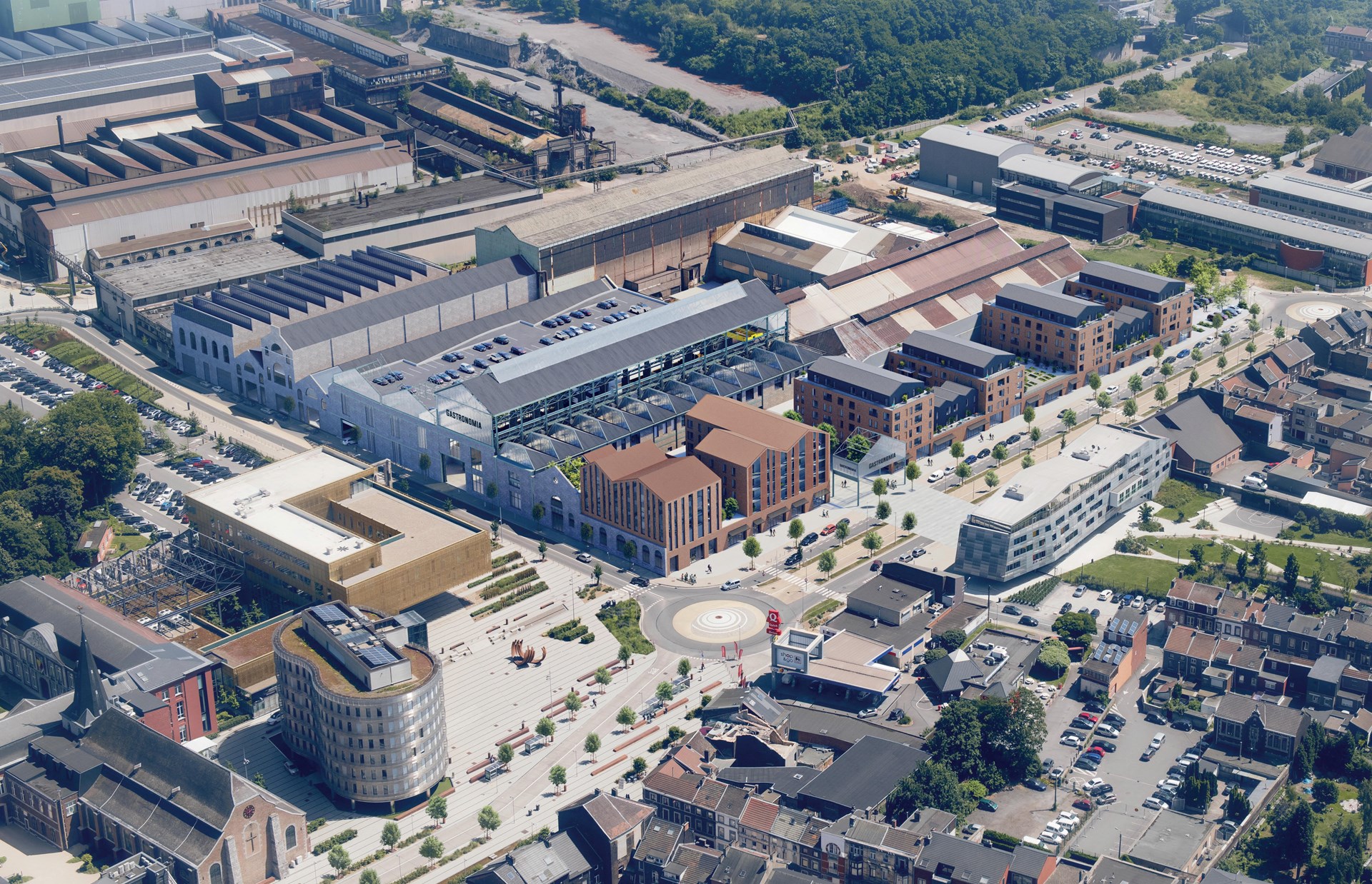 Au centre de Seraing, le projet Gastronomia s’inscrit dans le cadre de la reconversion d’anciennes halles industrielles en un lieu atypique qui rassemble des commerces de bouche, un food-court, un espace dédié au coworking et un parking paysager en plein air. Le projet amorce également la mutation urbaine d’anciennes grandes parcelles industrielles en surfaces dédiées majoritairement à l’habitation, aux commerces de proximité et aux bureaux.