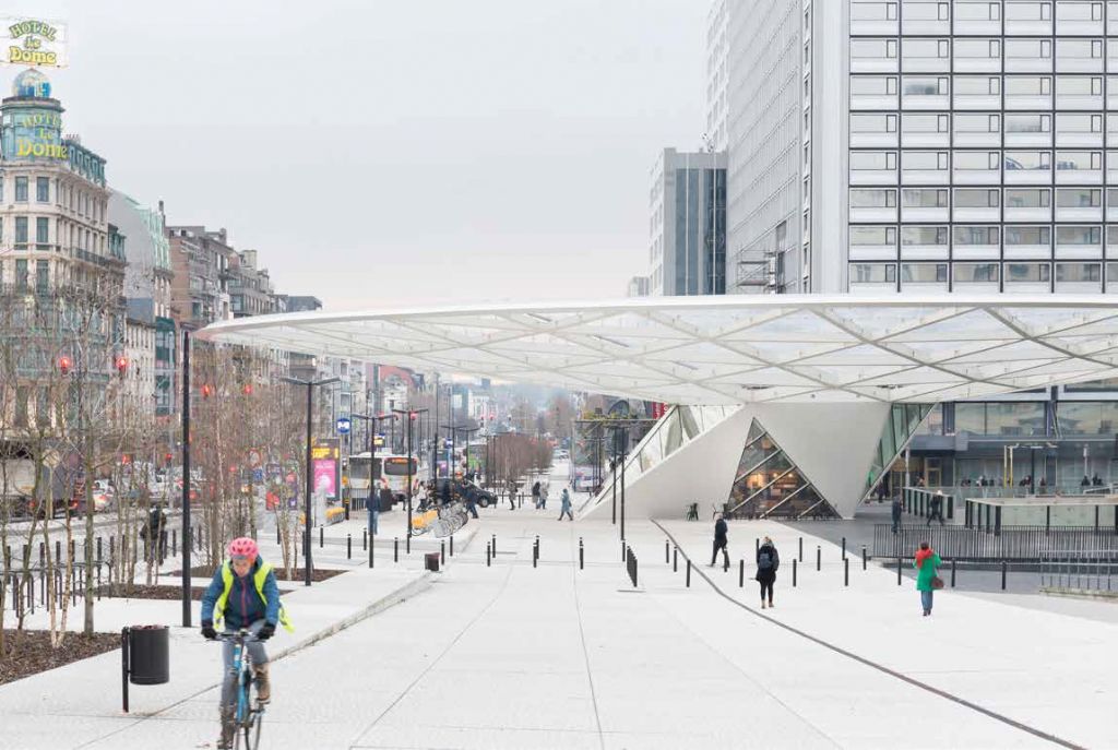 Un nouveau patio dans les sous-sols existants fournit de la lumière et un accès à la station de métro, à une salle de conférence et au parking. Le patio et la gare des bus sont couverts par un grand auvent en acier rond reposant sur un socle central qui surplombe à la fois la place que la petite ceinture. L'ensemble est constitué de structures triangulaires. Un bar est aménagé dans le socle.