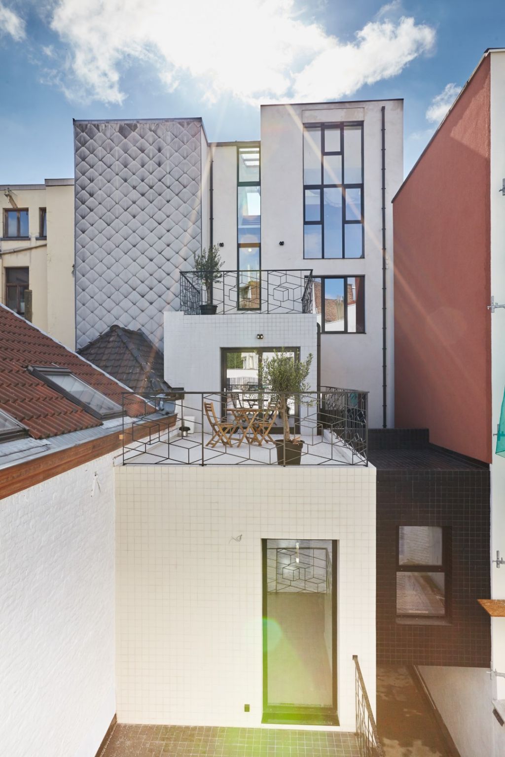 « Le projet joue avec les volumes pour créer des espaces extérieurs généreux attenants à chaque entité », expliquent les architectes. « La réflexion s’est portée sur la matérialité, les proportions, les couleurs et la lumière pour apporter une respiration entre les boîtes et un jeu de volumes cohérent. Au-delà de l’aspect ludique et conceptuel de ces cubes carrelés, c’est une exploration spatiale qui écarte tout encloisonnement de l’espace, afin d’articuler des fonctions complémentaires et d’offrir une autonomie aux 4 unités de typologie mixte pour un total de 400m² de superficie plancher. Ce jeu géométrique, par ailleurs repris comme motif de garde-corps, dans lequel le vide joue un rôle capital permet de créer des espaces extérieurs généreux, terrasses et patio. Ces respirations marquent le mouvement et baignent de lumière naturelle les logements. »