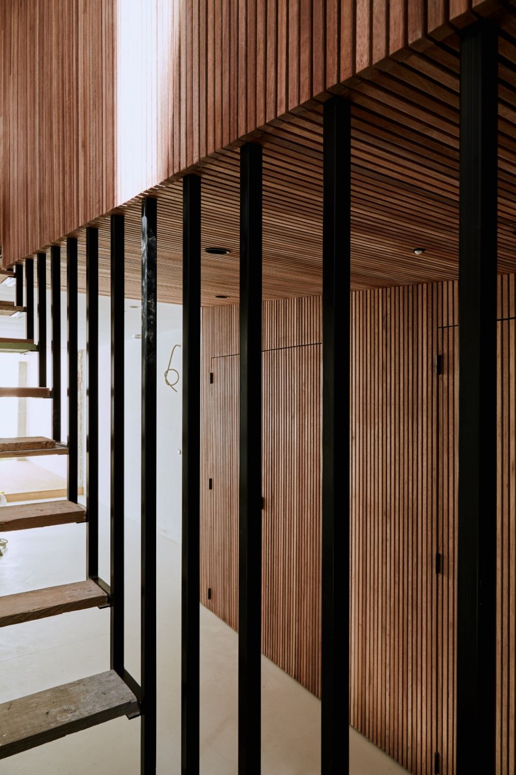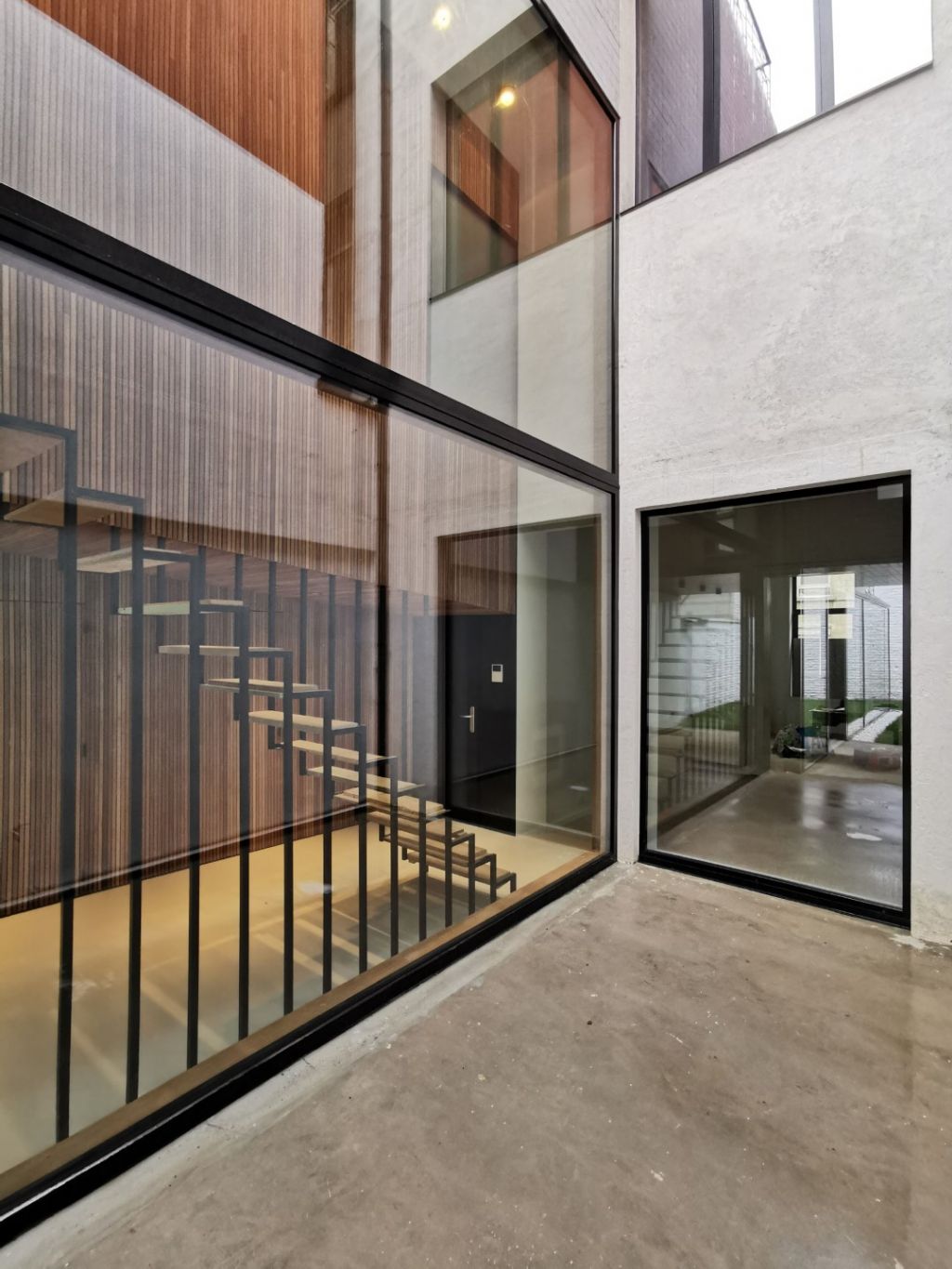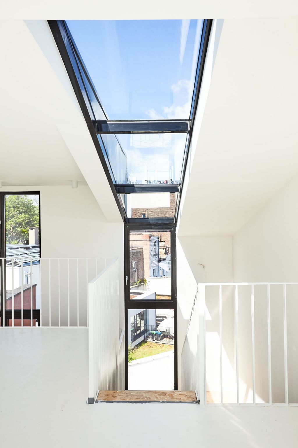 Au rez-de-chaussée, les fenêtres se font oublier et le patio éclaire les pièces centrales tout en permettant d’apprécier le jeu de volumes sous différentes perspectives. Le versant de toiture avant, conservé, est percé par de grandes fenêtres de toiture-balcon ouvrant une vue dégagée sur l’est de Bruxelles. Le pan de toiture arrière est entièrement réinterprété avec une rehausse de façade et une faille vitrée permettant de liaisonner les espaces de séjour sur une double hauteur baignée de lumière. Le recul des différents volumes les uns par rapport aux autres permet de préserver l’intimité des habitants. Chaque entité est respectueuse des vues par la disposition indirecte des baies vitrées.