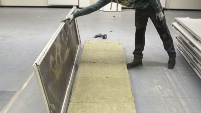 Marc Vanderick : « Tout est parti du fait que le client avait une très bonne idée de ce qu’il voulait faire et avait les moyens humains pour le faire. Avec l’aide du CSTC, il a dressé un inventaire des cloisons afin d’en permettre la réutilisation via l’entreprise Rotor. Dans le cahier des charges, il était précisé qu’il fallait suivre les indications du CSTC pour soit réemployer les cloisons telles quelles, soit pour faire en sorte de valoriser au maximum les matériaux qui les composent en séparant les parties métalliques de l’isolant. » Les deux grands axes qui avaient été définis étaient donc un réemploi intégral ou un recyclage des composants. Or, il se fait qu’au même moment, l’entreprise Louis De Waele avait un autre grand chantier en cours : la rénovation de 341 maisons sociales du Logis Floréal à Watermael-Boitsfort. Marc Vanderick s’est rendu compte que l’isolant de 8 cm de laine de roche présent dans les cloisons de l’immeuble Horta pouvait être réutilisé dans les toitures au Logis Floréal. Ici aussi, le CSTC est intervenu en soumettant un échantillon d’isolant à une batterie de tests afin d’en vérifier les caractéristiques techniques, comme le coefficient lambda. La porte était donc ouverte pour réutiliser les énormes quantités d’isolant au lieu de les recycler.