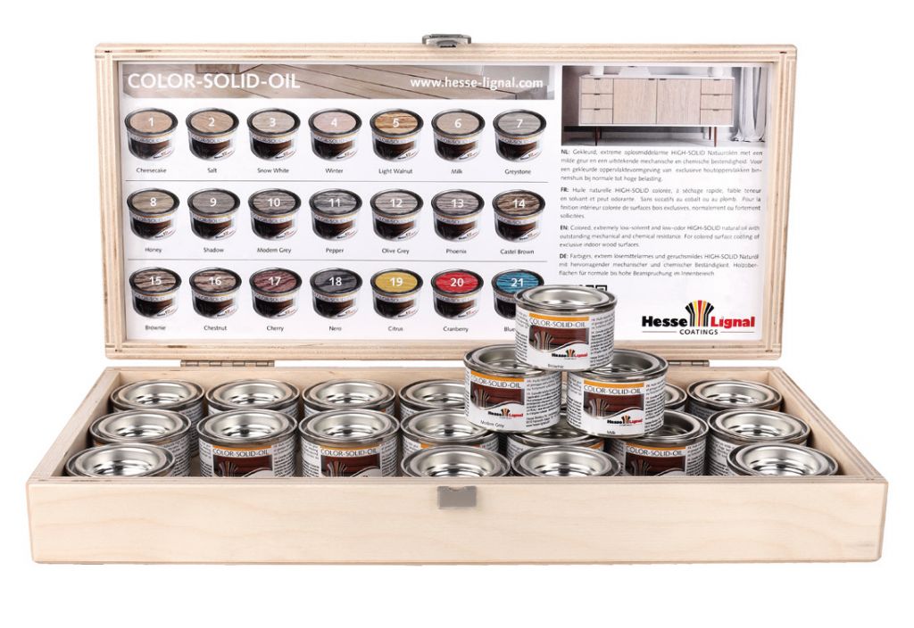 Actuellement, de nombreux points de livraison Hesse fournissent des boîtes d’échantillons contenant 21 échantillons liquides de teintes COLOR-SOLID-OIL exclusives. Ainsi, il est possible de démontrer immédiatement l’effet de couleur et la qualité de surface recherchés sur le bois souhaité, le tout directement chez le client. Une présélection est effectuée à l’aide d’un nuancier spécial, dans lequel les 21 teintes sont représentées sur des échantillons de bois véritable.