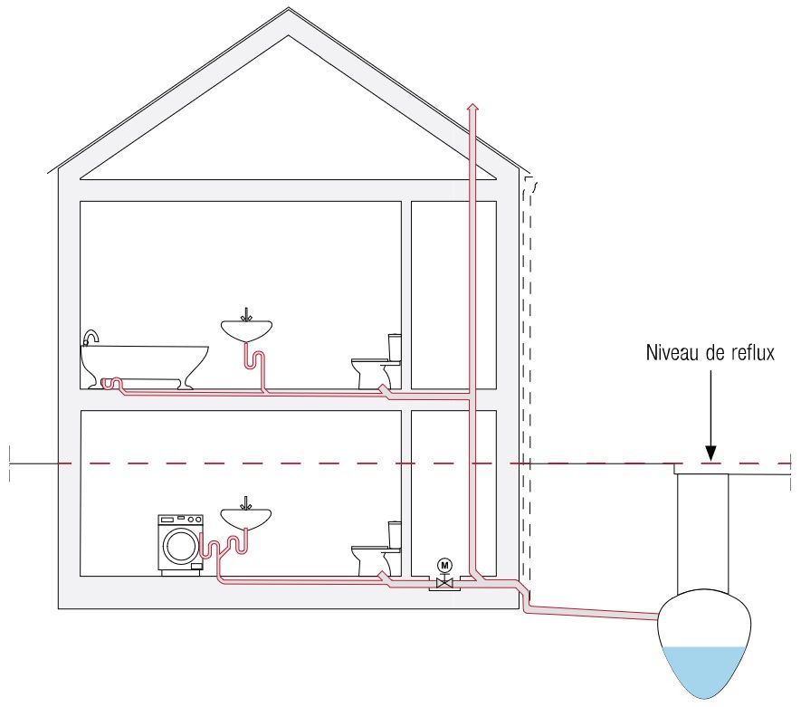 Si la bouche d’évacuation se trouve sous le niveau de reflux, et que les eaux usées s’évacuent vers l’égout par gravité, deux solutions sont possibles : soit les eaux sont aspirées par une pompe de relevage équipée d’une sécurité antirefoulement, soit le collecteur est muni d’un clapet antiretour.