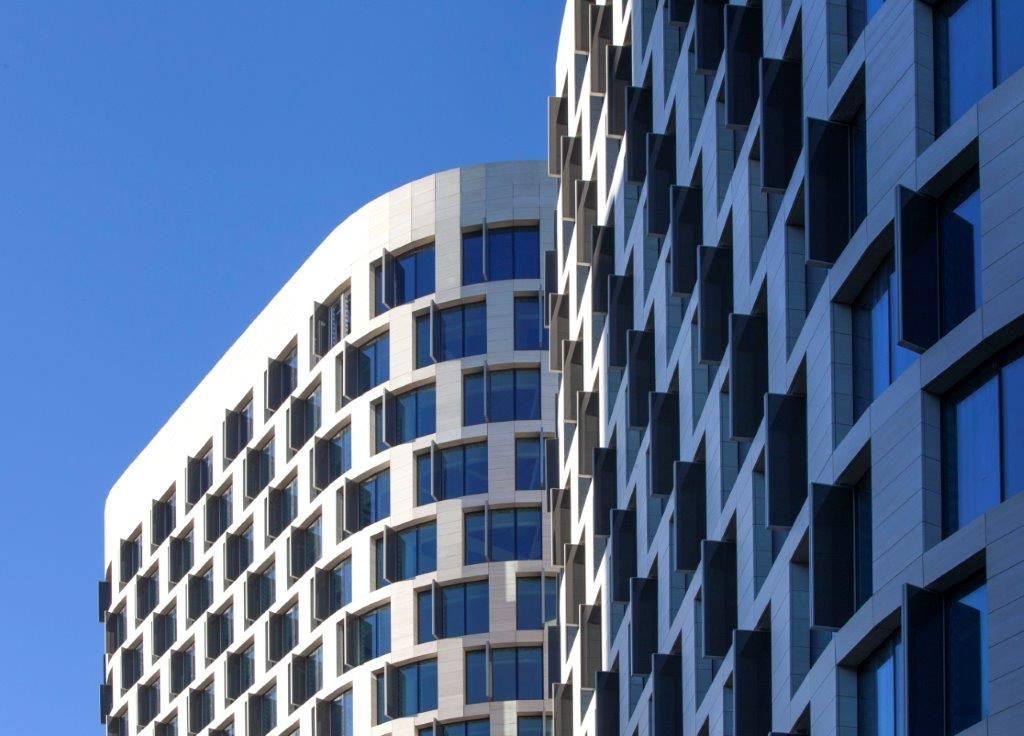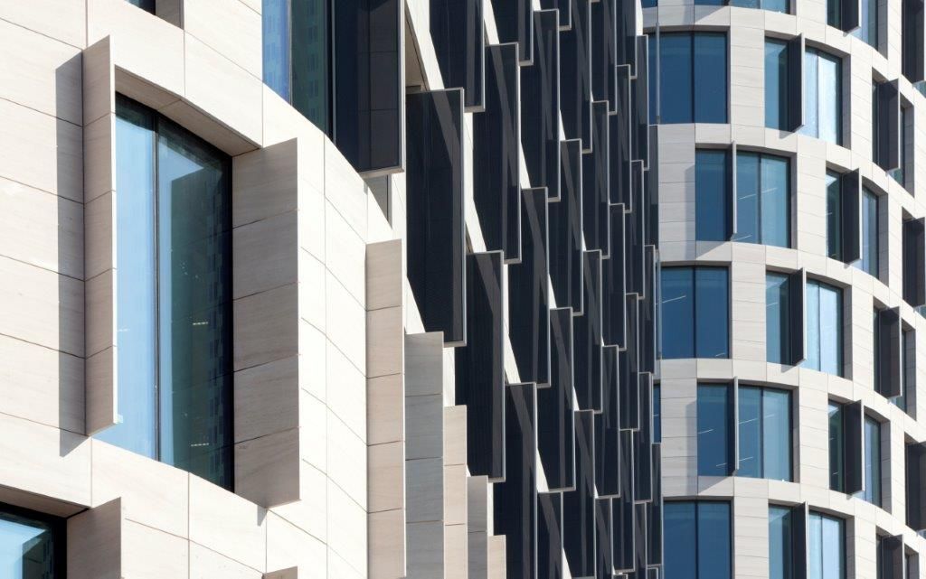 Le fait que le Quatuor soit perçu comme un point de repère élégant et homogène est certainement aussi dû à la conception sophistiquée de sa façade. Jean-Michel Jaspers : « Befimmo rêvait d'une architecture organique avec des angles arrondis et des toits en pente. Les tours ont une forme complexe, combinant triangles et ellipses. Il en résulte des façades courbes dont l'aspect et l'expression varient en fonction de l'angle d'approche. Seul le côté rue, où se trouvent l'entrée et la sortie du parking souterrain, présente une façade droite. Du point de vue de la conception, il n'était pas évident d'aligner tous les volumes géométriquement, mais nos efforts ont porté leurs fruits, car dans la pratique, le caractère fluide est très joliment exprimé. Associé à la hauteur variable des tours et à la finition uniforme des façades en pierre naturelle gris-beige, ce langage visuel spécifique crée une certaine unité dans la diversité. Le caractère relativement massif des façades se démarque également de la plupart des tours de bureaux du Quartier Nord, qui sont essentiellement habillées de verre. Avec son architecture fermée, Quatuor s'intègre mieux aux développements résidentiels de la partie intérieure du Petit Ring. De plus, la nuit, le bâtiment prend un aspect complètement différent de celui de la journée, grâce à un éclairage soigneusement choisi. »