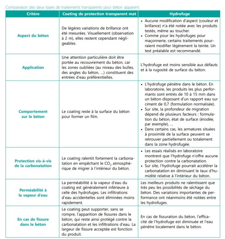 Les surfaces en béton apparent des bâtiments classés sont difficiles à réparer en raison de certaines contraintes liées à la conservation de leur aspect. Une étude récente montre que des traitements transparents mats ou hydrofuges pourraient répondre à la fois aux exigences de réparation des bétons et à la conservation de leur aspect. Chacun de ces produits a évidemment des implications et des avantages qui lui sont propres.
