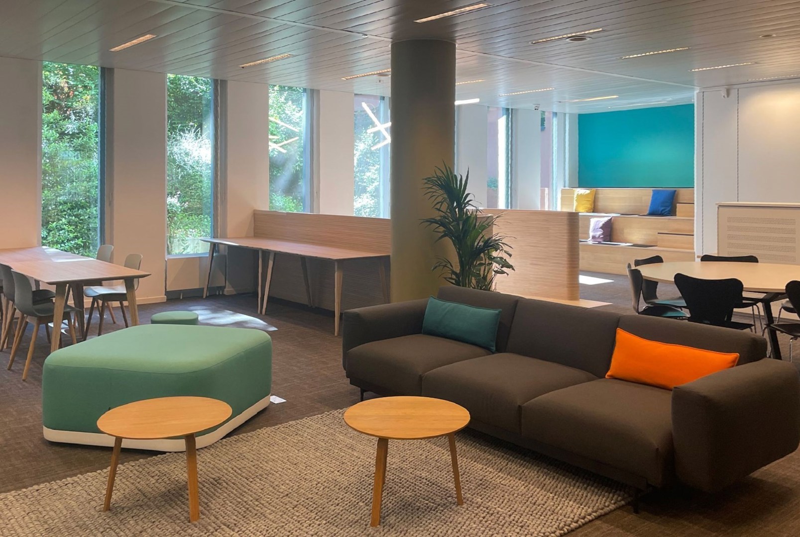 - La moquette existante a été nettoyée et laissée en place, le vinyle existant a été remplacé par une moquette 100 % sans PVC ni bitume, portant le label "Cradle to Cradle Gold".