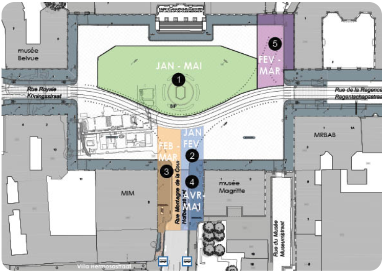 - Préparation du côté impair (Musée Magritte) : janvier – mi-février 2025