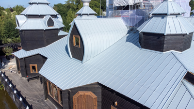Le toit de l’Izba n’est pas une surface simple, mais une composition complexe de tourelles, d’angles et de pentes. Aucune plaque n’est identique. « Chaque élément est d’abord mesuré et numéroté sur place, puis découpé sur mesure dans notre atelier », explique Deboodt. « Sur le chantier, nous réalisons les découpes spécifiques et les finitions. Vu la taille du toit, cette numérotation est cruciale. »